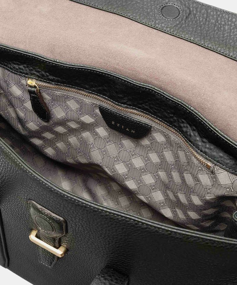 ふっくらとした柔らかなボディや、「シュリンクレザー」を多用した贅沢なデザインが、気持ちを豊かにしてくれて至福を味わえる、フラップブリーフケース。前面と両サイドの側面にかけて、ハギ(継ぎ目)をなくす一枚仕立てにすることで、やさしく丸みを帯びたフォルムへと導いています。