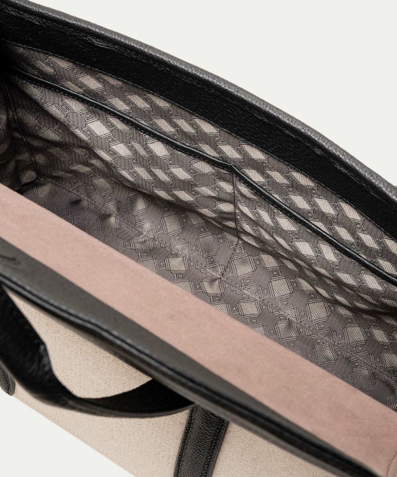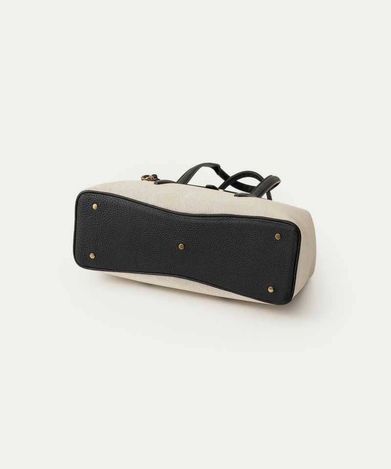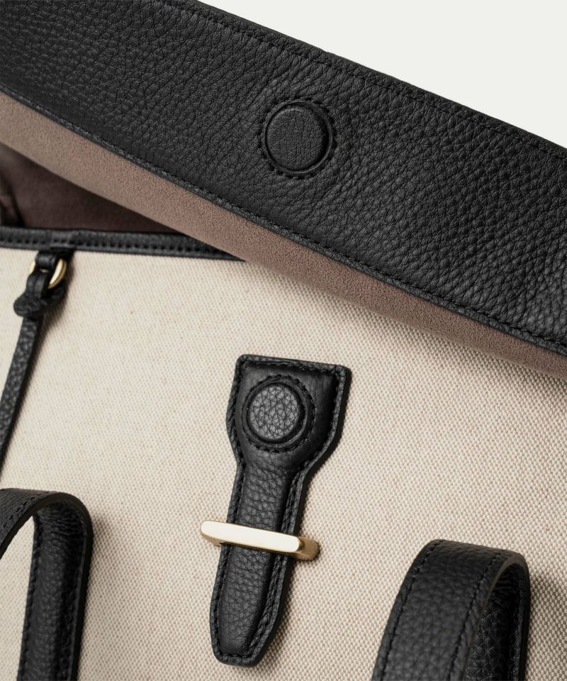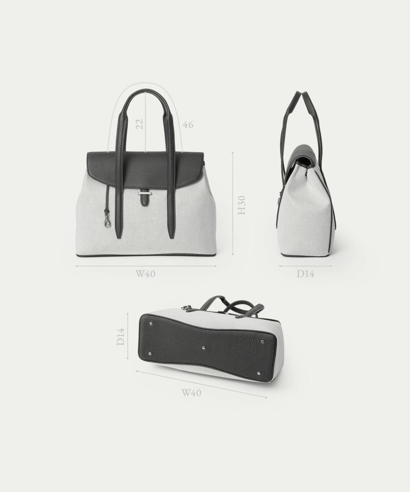 旅行・出張・ゴルフなどで少し荷物が多いときにも、上品にコーディネートして持ち歩ける、13インチのノートPCやA4の書類を収納できて手持ちハンドル仕様のフラップトートバッグ。フロントとマチが一体になった、「キャンバス生地」一枚仕立てにすることで、ふっくらとした美しいシルエットを叶えるとともに、サイドに設けられたスナップボタンでマチ幅を調整できたり、フラップをイミテーションの差し込み金具にしてマグネットで簡単に開け閉めできたりするなど、エレガントなデザイン性とカジュアルな機能性を併せ持っています。