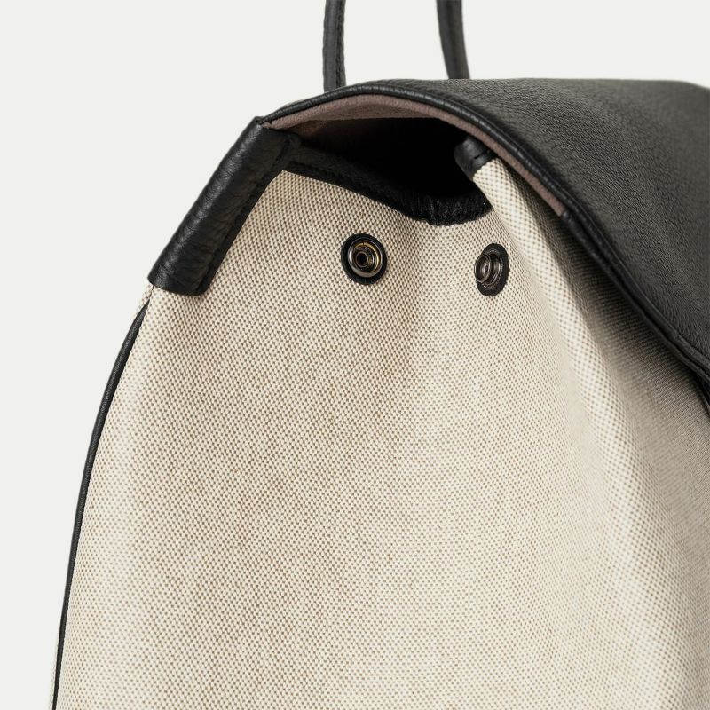 また、フラップ・ハンドル・底・ベルトに採用している「シュリンクレザー」は、「キャンバス生地」との絶妙なバランスでファッション性を高めながら、置いて自立させる際の安定感・バランス感にも貢献。マテリアルの融合だけでなく、クラシックさとモダンさを併せ持つハイブリットな佇まいも魅力になっています。