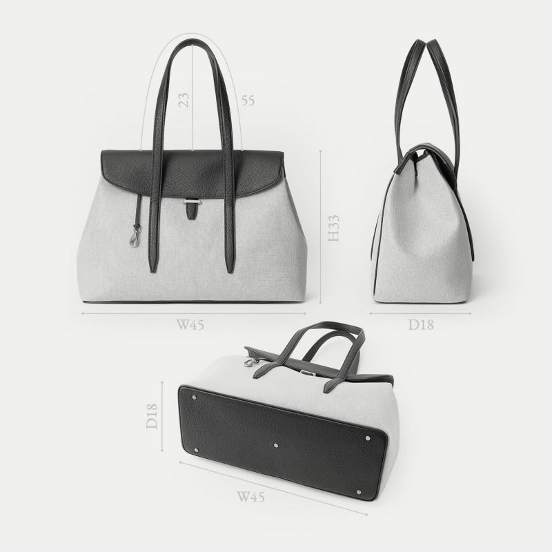 旅行・出張・ゴルフなどで少し荷物が多いときにも、上品にコーディネートして持ち歩ける、15インチのノートPCやB4の書類を収納できて肩掛けハンドル仕様のフラップトートバッグ。フロントとマチが一体になった、「キャンバス生地」一枚仕立てにすることで、ふっくらとした美しいシルエットを叶えるとともに、サイドに設けられたスナップボタンでマチ幅を調整できたり、フラップをイミテーションの差し込み金具にしてマグネットで簡単に開け閉めできたりするなど、エレガントなデザイン性とカジュアルな機能性を併せ持っています。