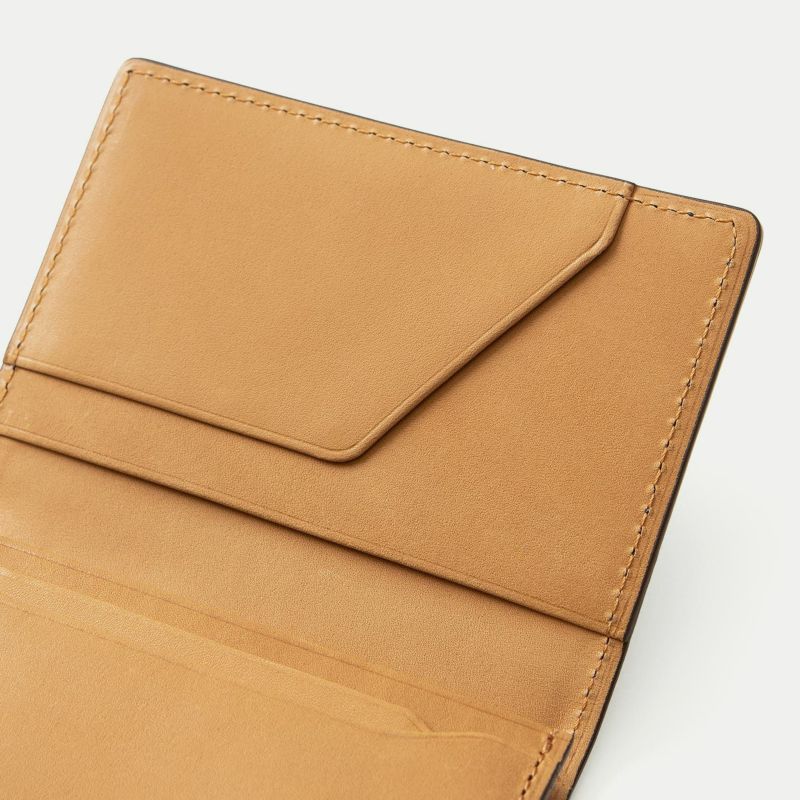 内装の「カーフ」は、きめ細やく滑らかでありながら、適度な弾力によるナチュラルなタッチ感が抜群で、ビジネスシーンでも気持ち良く扱うことが可能。さらに、メインポケットは、収納力が高い通しマチの構造で名刺を30枚ほど収納できるほか、波紋をイメージされる魅力的なカッティングのカードポケットなど合計4枚収納でき、コンパクトなサイズながらデザイン性と収納性を併せ持っています。
