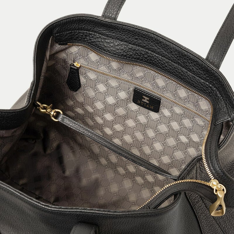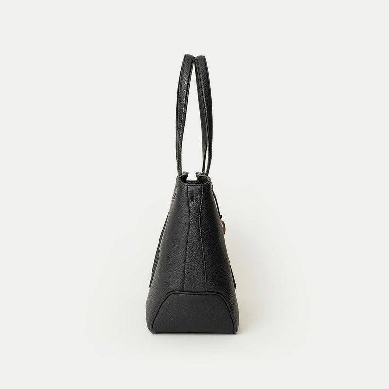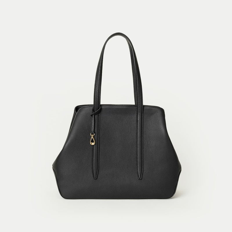 また、バッグの上部を、左右のマチに向かって下がっていくラインにしているのは、マチを内側に折り畳んでも天ファスナーがぶつからないための機能性とともに、エレガントで個性的な見た目の美しさも両立。さらに、底マチは、くびれをセンターに施すことで、肩掛けするときに体にフィットしてスムーズに持ち歩ける実用性と、独特のライン&フォルムがアクセントになっているデザイン性も兼ね備え、フォーマルにもカジュアルにもフレキシブルに活躍してくれます。