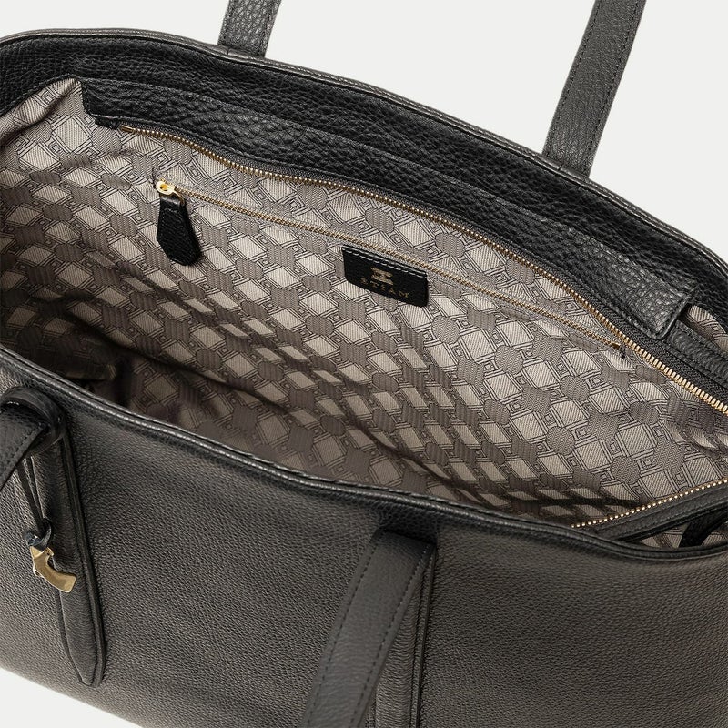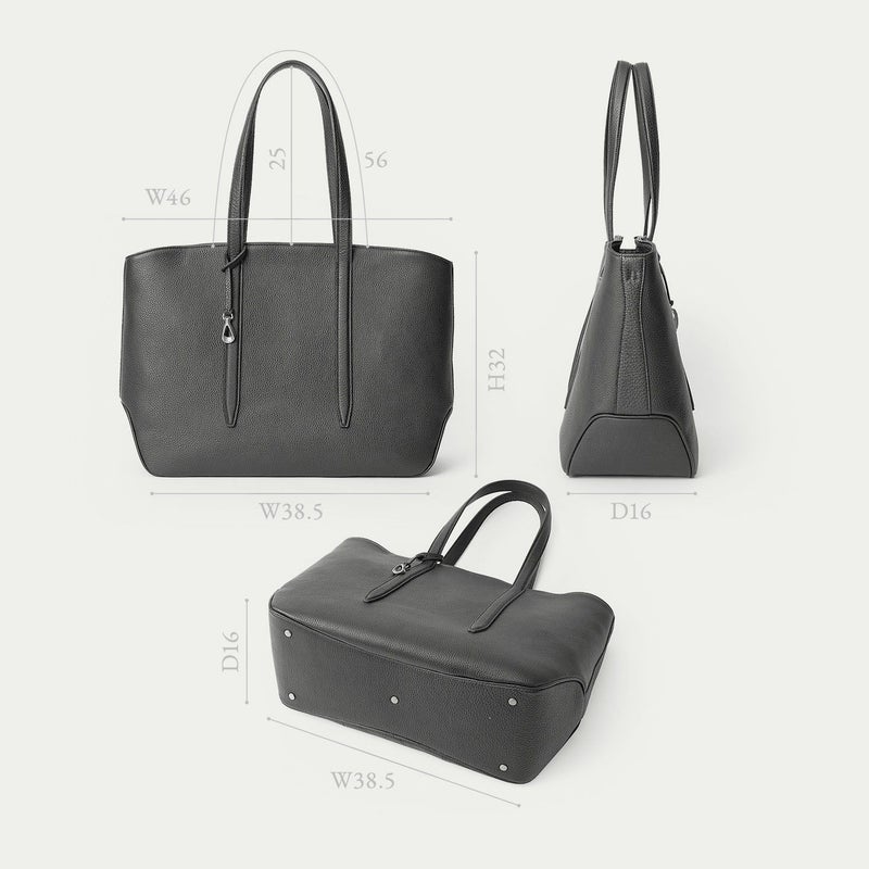 ソフトで馴染みやすい仕上がりで、ビジネスにもプライベートにも柔軟に使える、B4サイズを収納可能なファスナー開閉式のトートバッグ。会社への出勤やカフェでのリモートワークには、ノートパソコンなどを収納・携帯するために大容量が必要ですが、休日などで収納・携帯する物が少ないときには、マチを内側に折り畳んでコンパクトにすることができ、2通りのシルエットを用途に合わせて自由に楽しめるのも魅力です。