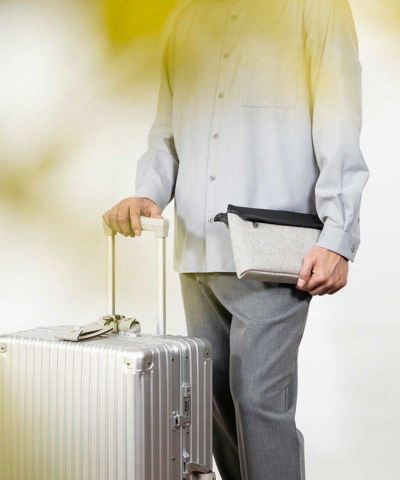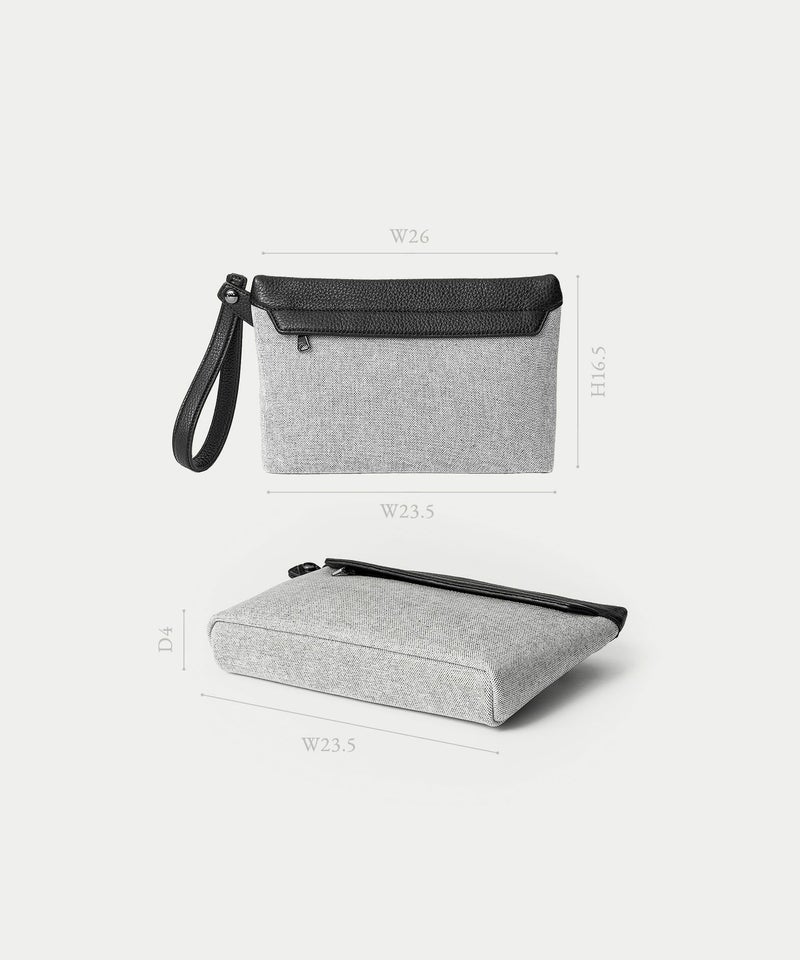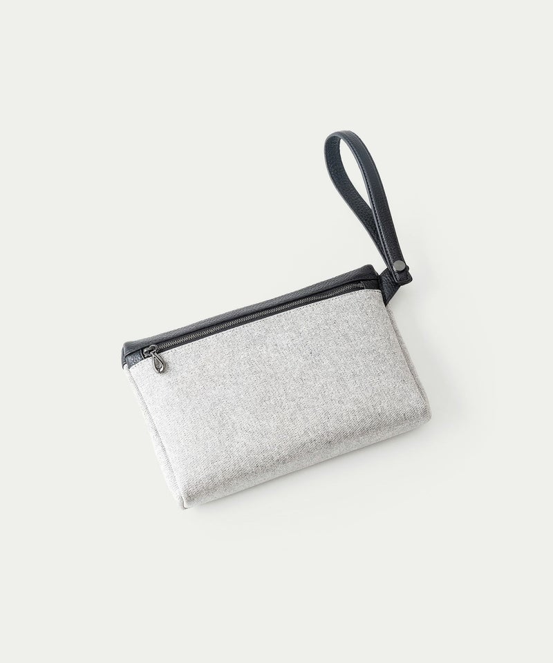スポーティーでありながらエレガンスを忘れない “エレガンテ・スポルティーヴォ”を、コンセプトにしているブランドのライダースジャケットに合う、クラッチバッグほど堅苦しくなく、一般的なポーチほど簡易的すぎない、洗練されたカジュアルなアイテムへと昇華。奥行き感のあるマットな仕上げのメイン素材「キャンバス生地」を駆使し、全面&側面・背面&底面を一枚で繋げることで、ソフトで丸みを帯びたフォルムへと導いています。「キャンバス生地」と「シュリンクレザー」の裏面に弾力のある芯材を用いることで、柔らかいながらもハリがあり、型崩れもしにくく、キレイな状態を長く保てる工夫をしています。