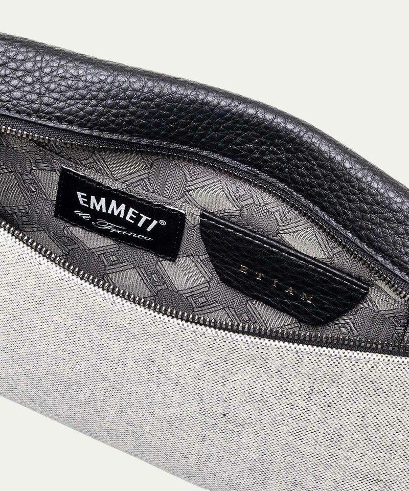 イタリアのラグジュアリーアウターブランド『EMMETI(エンメティ)』と、『ETiAM』がコラボレーションをすることで、エレガントなシルエットを実現したポーチ。レザーを中心にファーやファブリックなどの高級素材を巧みに組み合わせ、程よいラグジュアリー感を演出する『EMMETI』のラインナップは、素材使いだけでなく人間の体躯を熟知した絶妙なフィッティングも大きな魅力になっています。
