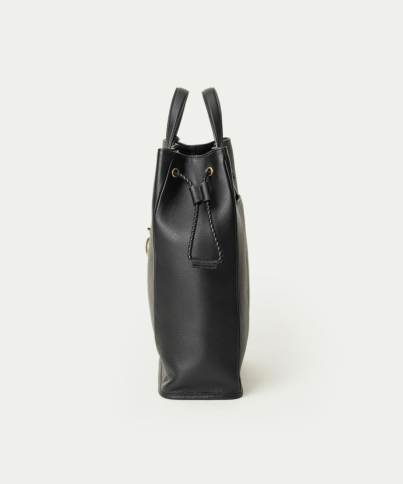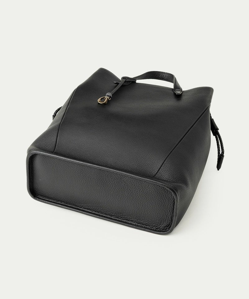 フォルムの変化に柔軟な曲がり方で自然に対応しながら、しっかりとA4サイズを収納できる、ドローストリングショルダーバッグL。シボ感が美しい「シュリンクレザー」のボディに、優雅な曲線のハギ(繋ぎ目)を、マチ上部から前面下部にかけて左右シンメトリーで設けることで、縦のラインを強調しています。また、肉厚で丈夫なハンドルとの接続を、縫製ではなくリベット式にして、よりスッキリとした軽快な印象へ。ハンドルの立ち上げを少し高く設け、手持ちだけなく手首に通して持つこともでき、取り外し可能なショルダーベルトとの2WAYで、気分や用途に合わせたスタイルで持ち歩くことができます。
