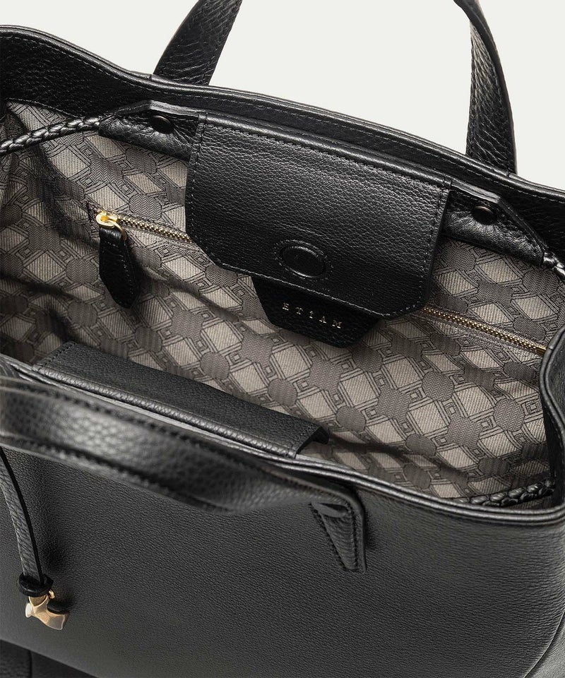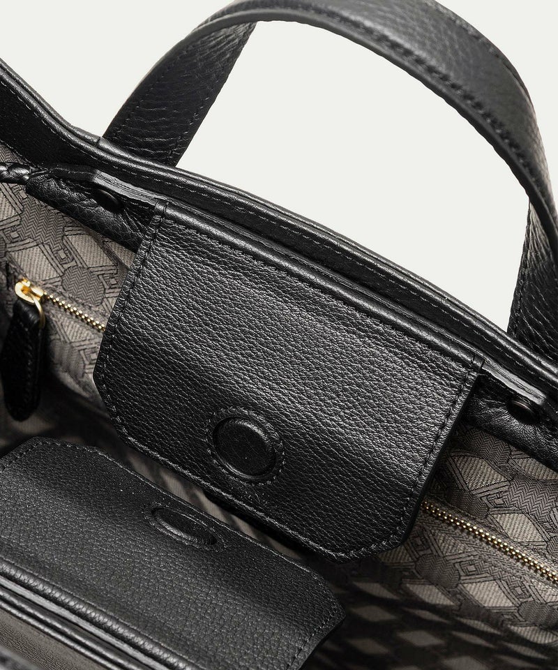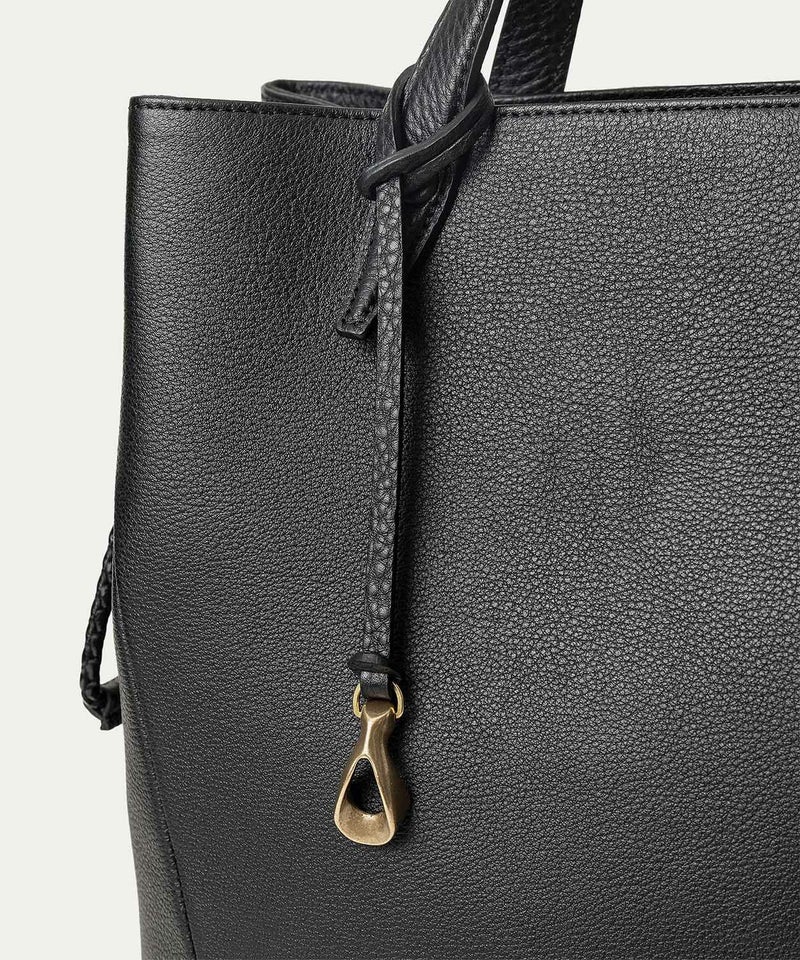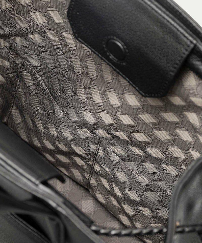 広めのレザーパーツを備えたマグネット式の開口部は、隙間を狭めて中身の収納物をさりげなく隠す役割も。あえて開閉具を設けていない背面ポケットは、スマートフォン・パスケース・駐車券などを、さっと取り出せる快適さを追求。さらに、弾力性のある柔らかなボディに対して、底面をレザーフレーム構造で硬めに仕上げて、美しいシルエットをキープしています。