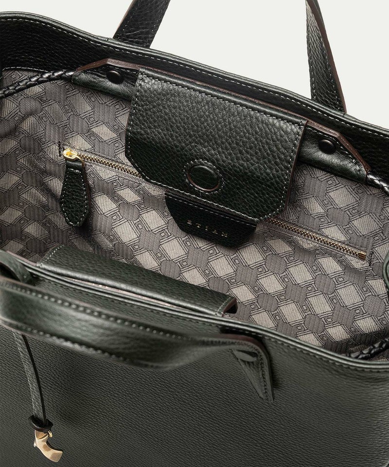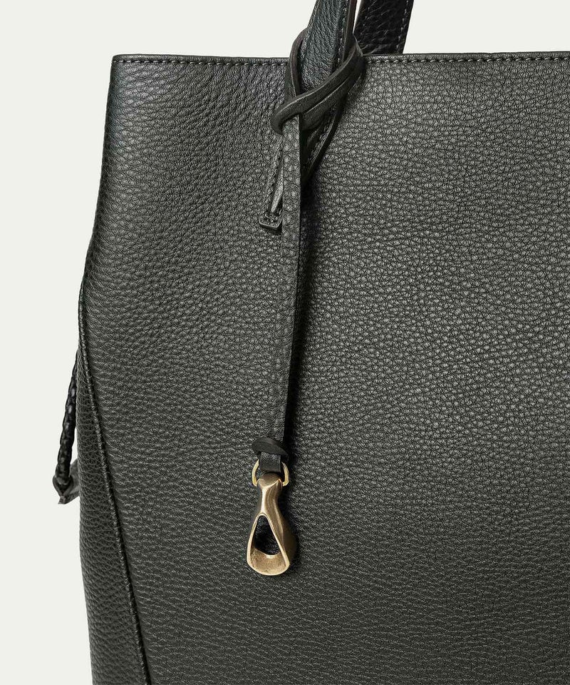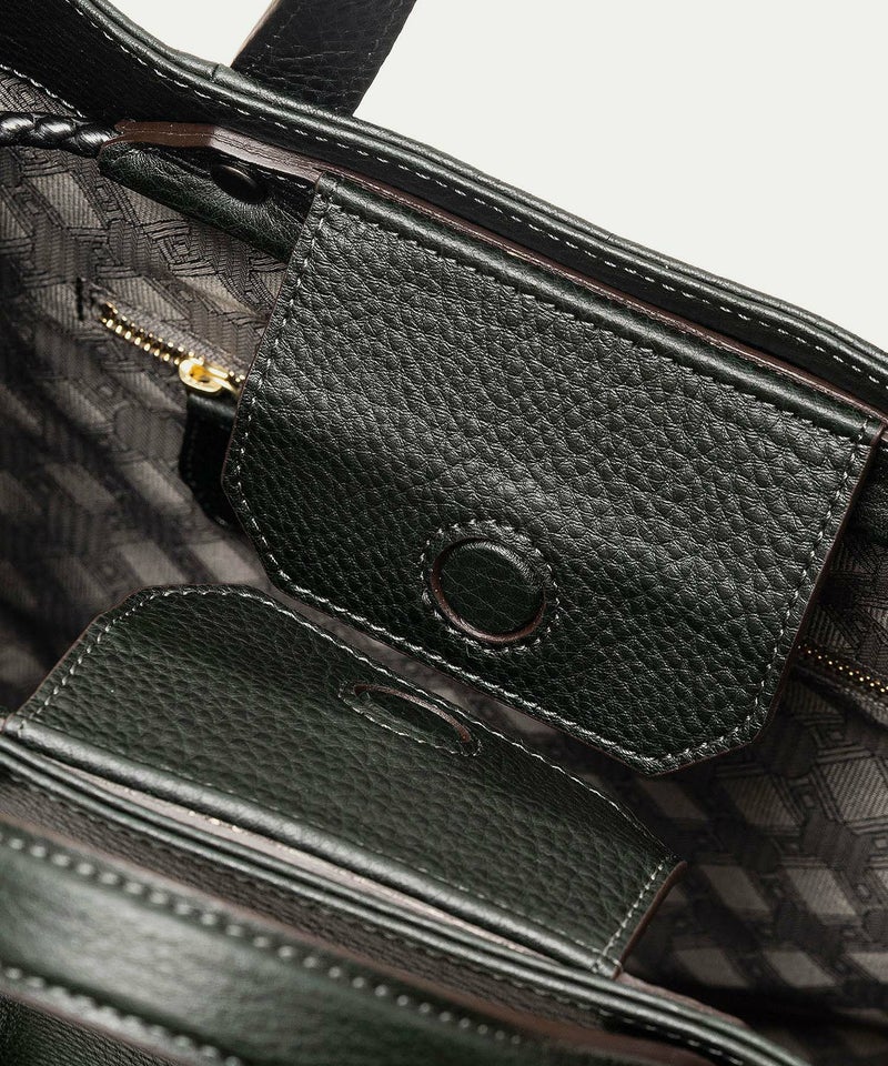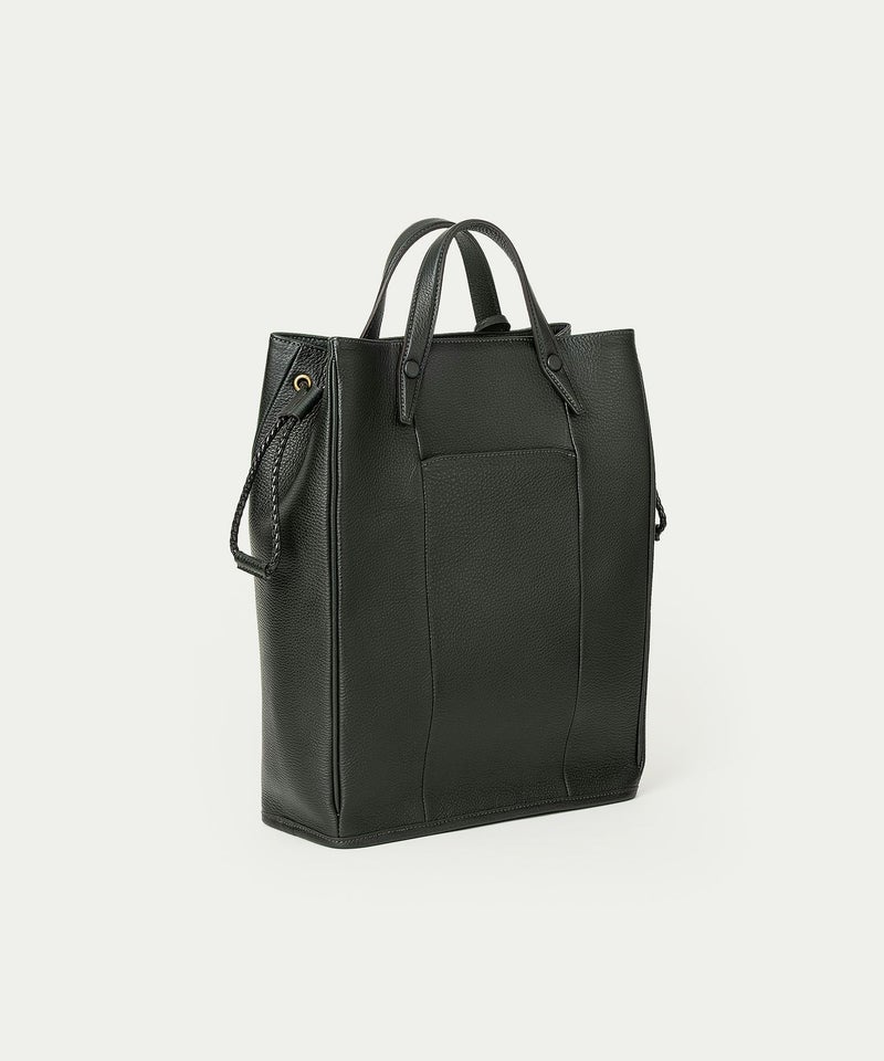 広めのレザーパーツを備えたマグネット式の開口部は、隙間を狭めて中身の収納物をさりげなく隠す役割も。あえて開閉具を設けていない背面ポケットは、スマートフォン・パスケース・駐車券などを、さっと取り出せる快適さを追求。さらに、弾力性のある柔らかなボディに対して、底面をレザーフレーム構造で硬めに仕上げて、美しいシルエットをキープしています。