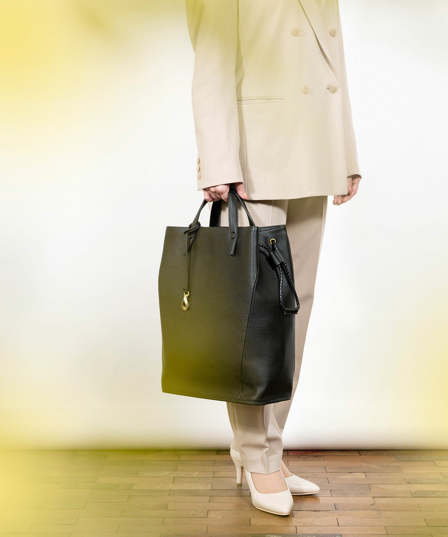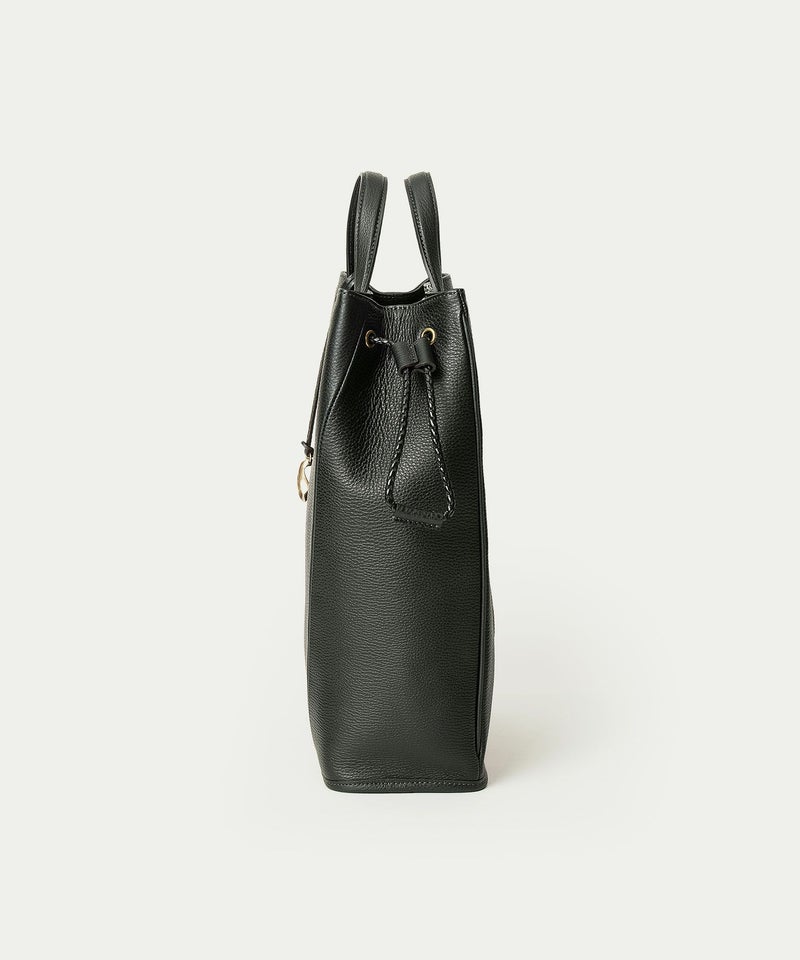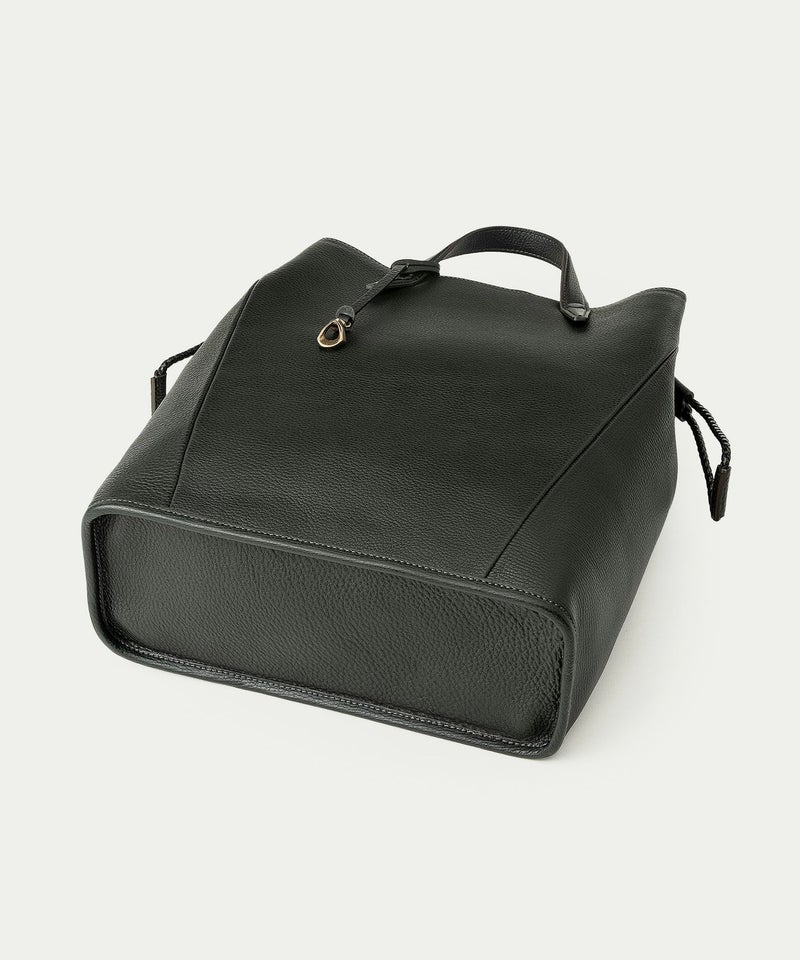 フォルムの変化に柔軟な曲がり方で自然に対応しながら、しっかりとA4サイズを収納できる、ドローストリングショルダーバッグL。シボ感が美しい「シュリンクレザー」のボディに、優雅な曲線のハギ(繋ぎ目)を、マチ上部から前面下部にかけて左右シンメトリーで設けることで、縦のラインを強調しています。また、肉厚で丈夫なハンドルとの接続を、縫製ではなくリベット式にして、よりスッキリとした軽快な印象へ。ハンドルの立ち上げを少し高く設け、手持ちだけなく手首に通して持つこともでき、取り外し可能なショルダーベルトとの2WAYで、気分や用途に合わせたスタイルで持ち歩くことができます。
