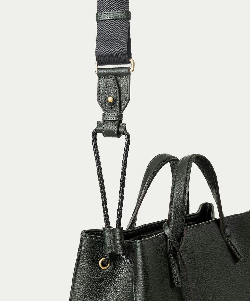 巾着型のドローストリング仕様で、紐の動きが美しく絞られたマチに遊び心を添えながら、前面・背面は内装に通すことで、洗練されたスタイリュシュな佇まいへ。レザーを編み込んだような上質なポリエステル製で、強度にも優れており、先端のレザー部にショルダーベルトを接続できる設計になっています。しなやかで柔軟な接続部が、軽やかでアクティブな雰囲気を演出。シルクのような光沢感が美しいナイロンテープは、カジュアルになりがちな斜め掛けも上品に引き立ててくれます。