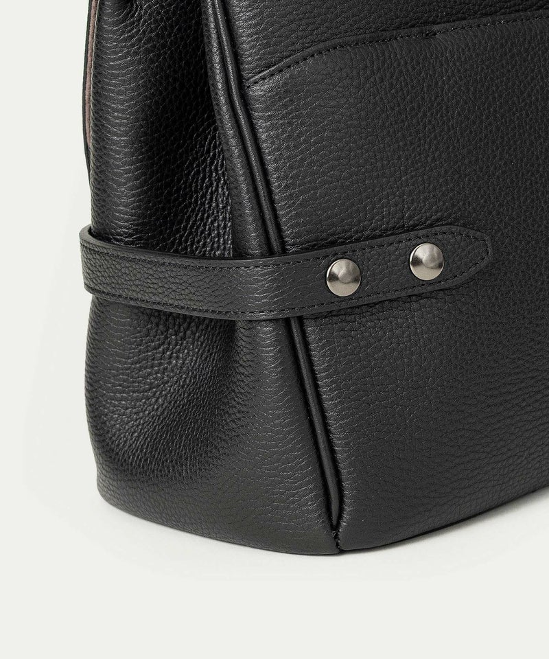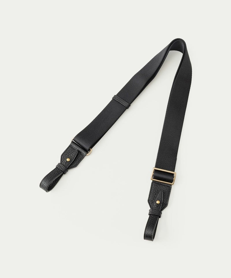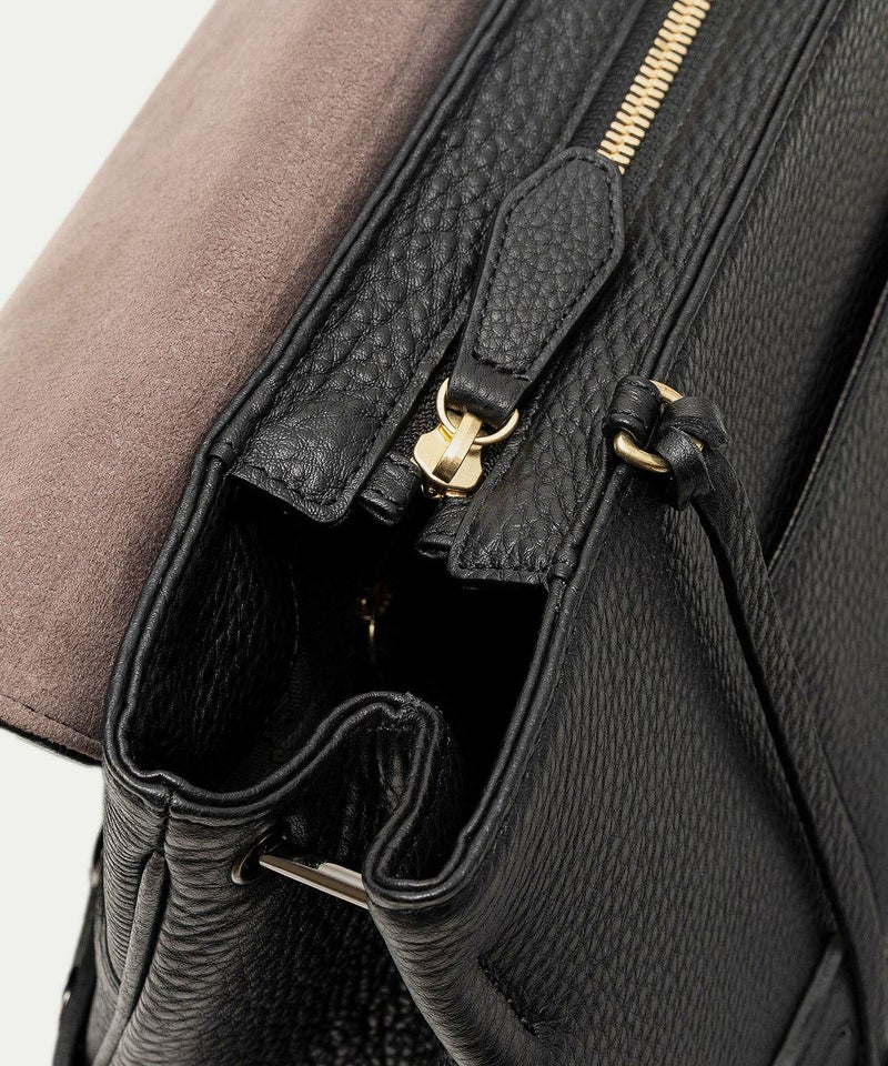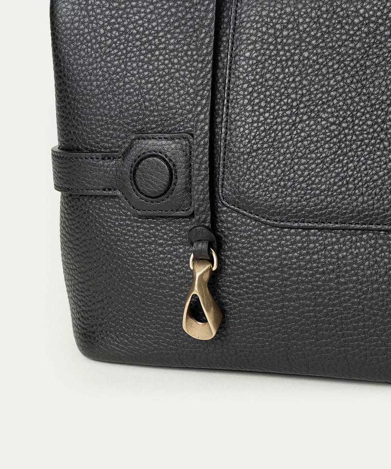 背面のフリーポケットは、あえて開閉具を設けない大きめの設計なので、頻繁に出し入れする収納に便利。また、背面の両サイドに、マチのベルトのホックも備えており、荷物が少ないときなどにはホックの位置を変えることで、マチの幅を狭めることもできます。マチの上部に取り付けているショルダーベルトの接続金具には、ブラックニッケルメッキを施したオリジナル真鍮金具を採用。ショルダーベルトを外しているときでも目立つことなく、洗練された雰囲気を醸し出します。