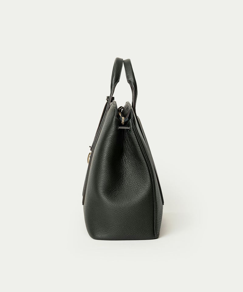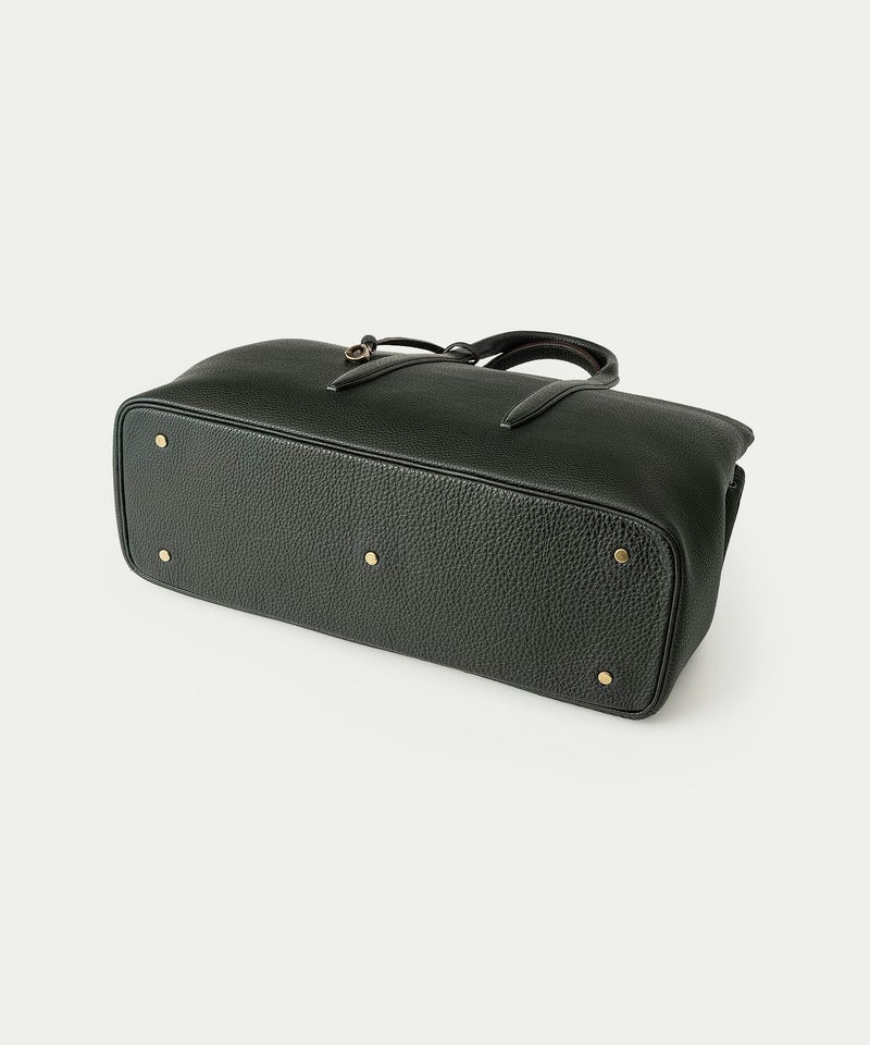 手首にも通せるハンドルは、厚みを備えさせることで安定感を確保。また、ボディに長く沿わせることで、荷重を支えながら型崩れを防ぎ、機能美へと昇華させています。上面の開口部は、YKK最高峰エクセラWのファスナー式で、上面より一段下げた位置にして、ファスナーが見えにくくスッキリとした印象へ。ファスナーの端は、レザーで覆って上品に仕立てているとともに、開けた状態でも美しいシルエットのまま使いこなせます。