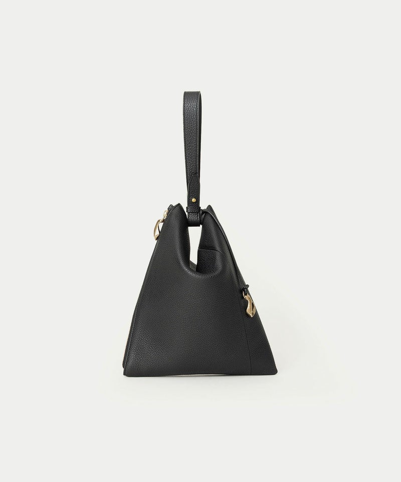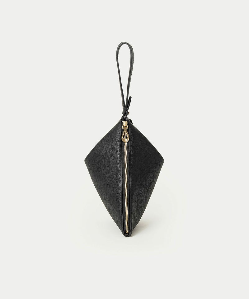 シボ感が美しい「シュリンクレザー」のボディに、柔らかくて程よいハリのある芯材を用いることで、型崩れしにくくキレイな形状のまま長く使いこなせるのも魅力。ハギ(繋ぎ目)は、前面センターに入れるのではなく、あえて両サイド斜めに設けることで、上部の三角形を生かした菱形のエレガントな印象へ。同じ素材のレザーストラップは、接続金具を軸にフレキシブルに回転し、軽やかに手首に通して持ち歩くことができます。