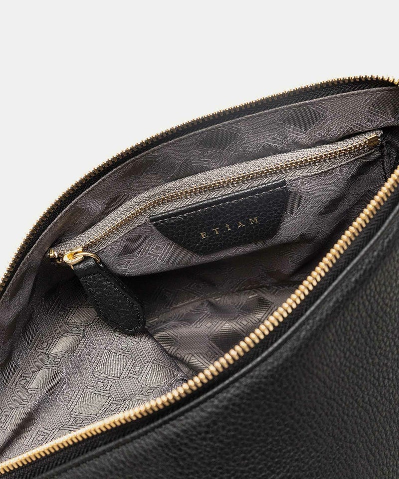背面の開閉には、YKK最高峰のエクセラWファスナーを採用し、スマートフォンやミニ財布などをしっかり収納・携帯することが可能。内装にはファスナーポケットを備えているので、鍵・パスケース・小物などを整理して入れておけます。また、下部を内側に折り畳むことで平たくコンパクトにでき、かさばらずにバッグやスーツケースに収納することも。普段使いだけでなく、旅先や出張先などでもスマートに活躍してくれます。
