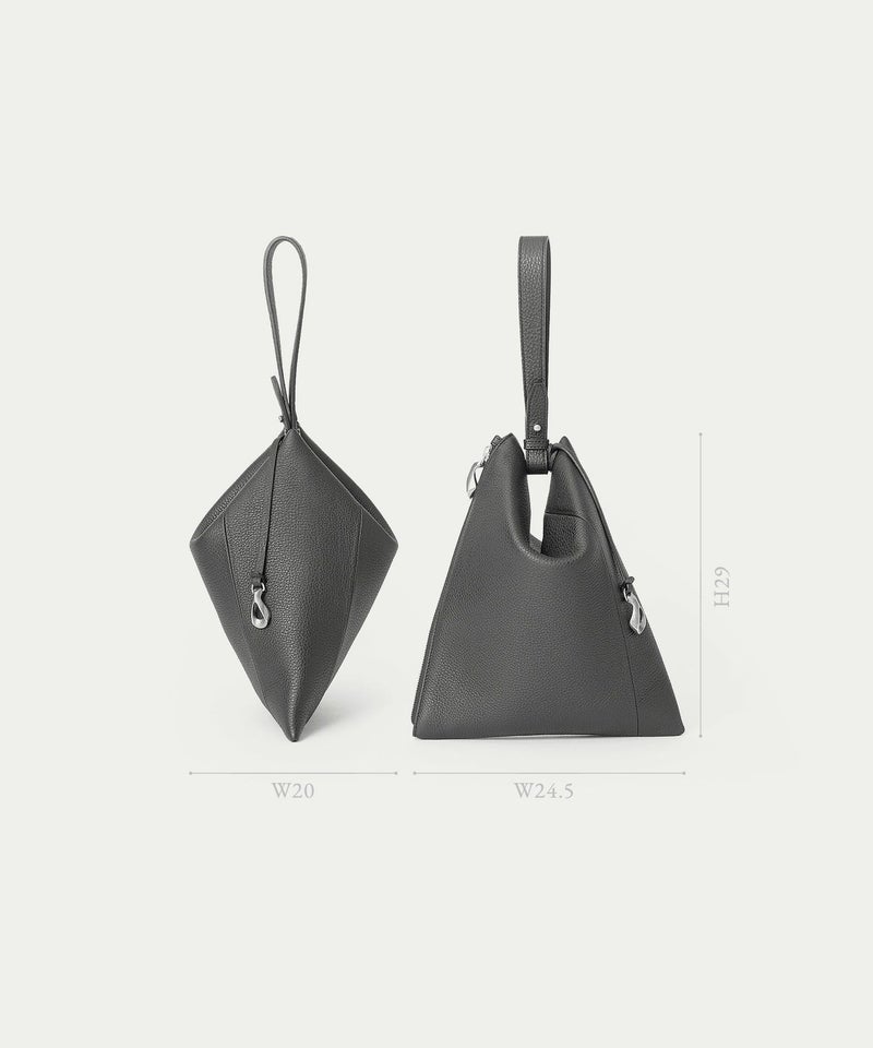 シボ感が美しい「シュリンクレザー」のボディに、柔らかくて程よいハリのある芯材を用いることで、型崩れしにくくキレイな形状のまま長く使いこなせるのも魅力。ハギ(繋ぎ目)は、前面センターに入れるのではなく、あえて両サイド斜めに設けることで、上部の三角形を生かした菱形のエレガントな印象へ。同じ素材のレザーストラップは、接続金具を軸にフレキシブルに回転し、軽やかに手首に通して持ち歩くことができます。