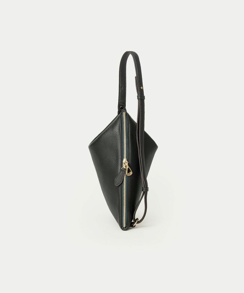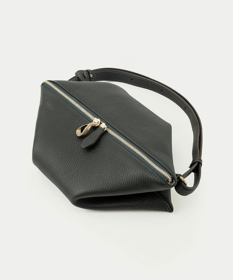 まるで幾何学模様の頂点をイメージさせるようなシャープなフォルムが、何気ない日常の装いに印象的な存在感を添えてくれる、トライアングルショルダーバッグ。ボディとショルダーベルトの接続用に開発したオリジナル金具が、たわみが美しい巾着のような独特のシルエットを生み、トライアングルを想わせる端正なラインを描き出しています。