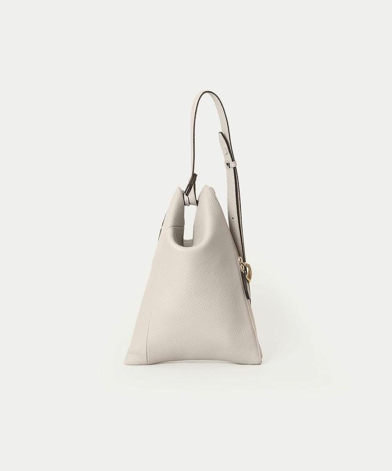 まるで幾何学模様の頂点をイメージさせるようなシャープなフォルムが、何気ない日常の装いに印象的な存在感を添えてくれる、トライアングルショルダーバッグ。ボディとショルダーベルトの接続用に開発したオリジナル金具が、たわみが美しい巾着のような独特のシルエットを生み、トライアングルを想わせる端正なラインを描き出しています。