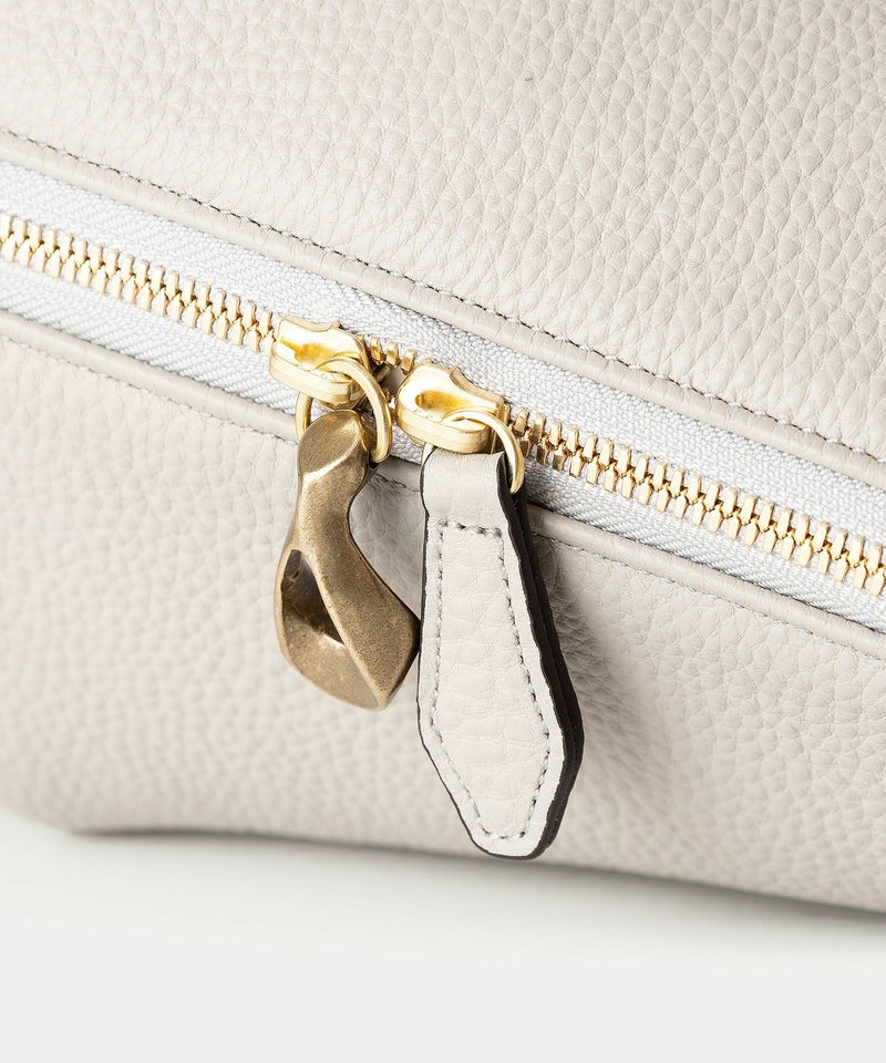 背面の開閉には、YKK最高峰のエクセラWファスナーを使用し、スマートフォン・ミニ財布・ペットボトルなどをしっかりと収納。また、内装にはファスナーポケットを装備し、鍵・パスケース・小物などを整理して持ち運べます。さらに、下部を内側に折り畳むことでコンパクトにでき、かさばらずにバッグやスーツケースへの収納も。普段使いはもちろん、旅先や出張先などでも性別を問わずスタイリッシュに使いこなせます。