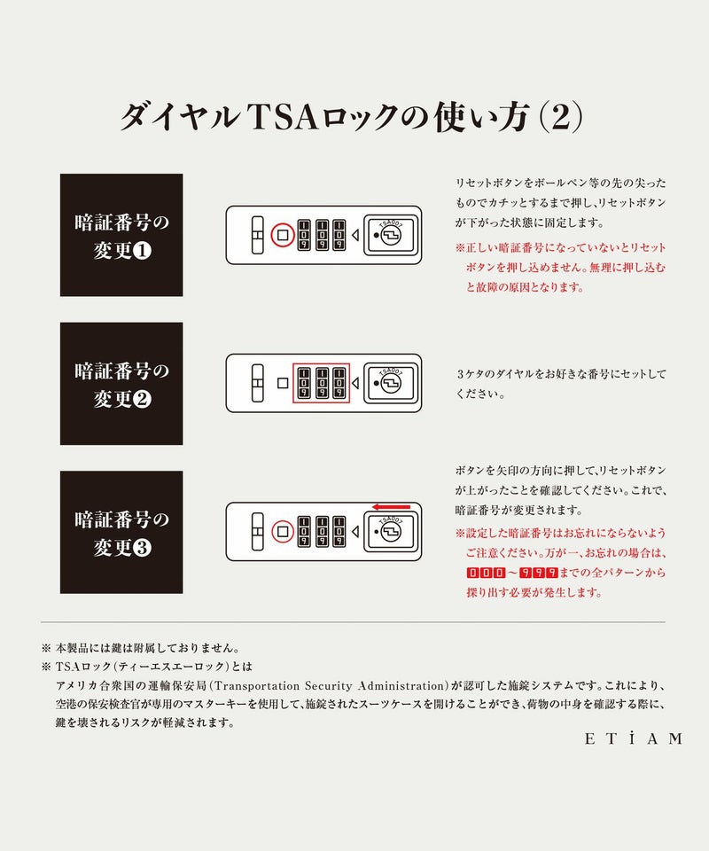 ※TSA承認ロック:アメリカ(ハワイ等も含む)渡航の際、TSA公認の製品に限り鍵を掛けて預けることが可能。国際空港での検査にも対応しており、鍵穴は空港職員専用。この製品のTSAロックは、米国連邦航空省運輸保安局が認定し、TRAVELSENTRY社が管理・運営しているシステムです。
