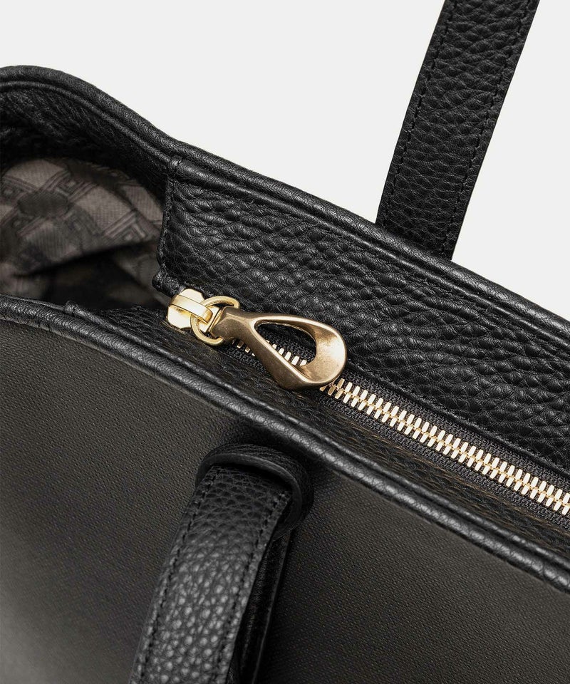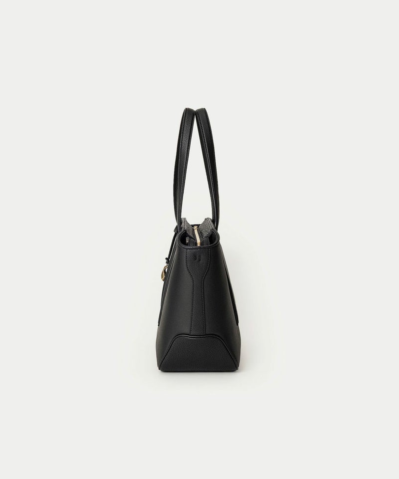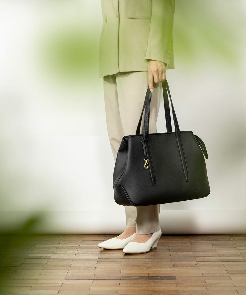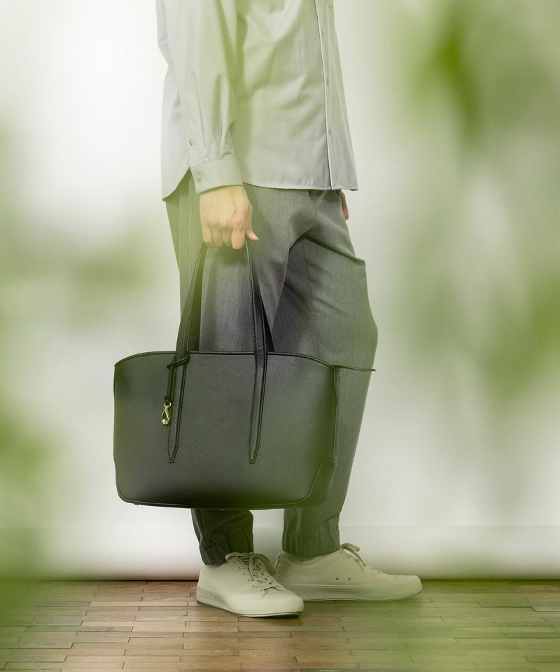 メイン素材の「キャンバス生地」表面に、墨黒のポリウレタン加工を施すことで、高級感あふれるレザーや織物のような質感を纏わせた、ファスナー開閉式のトートバッグ。独特の風合いを醸し出すとともに、一年を通してコーディネートしやすく、生地目を残しながら汚れが目立ちにくいのも魅力です。その裏面にはスポンジ加工を施し、シワにならない弾力感のある柔らかさと、張りのある美しいシルエットを実現。荷物が多いビジネスシーンでは、A4サイズや13インチのノートPCを収納できる大容量を叶えながら、荷物が少ないプライベートシーンでは、マチを内側に折り畳んでコンパクトにもでき、用途に合わせて2通りのシルエットをフレキシブルに楽しめます。