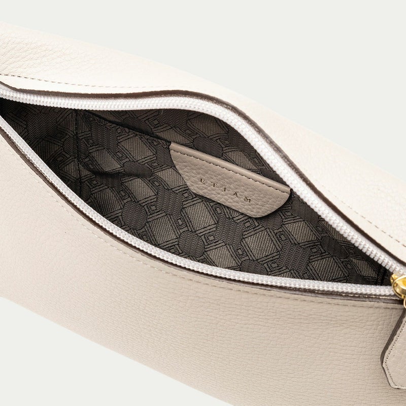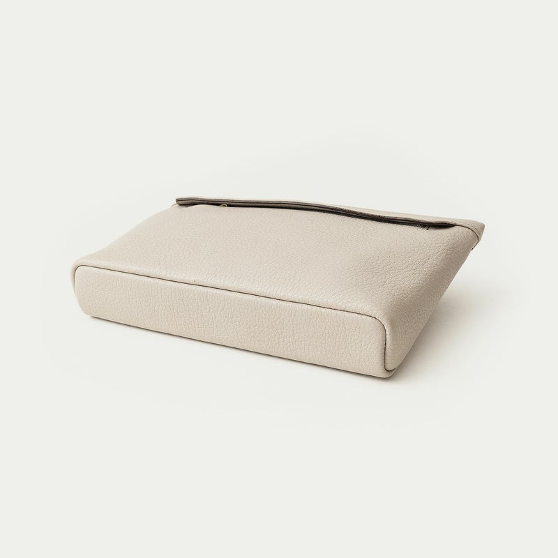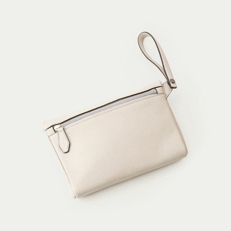 コンパクトながらも長財布を収納できるサイズ感で、ストラップを手首に引っ掛けたり手持ちしたりしながら、軽やかに素早く持ち歩いて行けるポーチ。スポンジ状の芯材を使用することで、外装の「シュリンクレザー」にも程よい弾力を与えて、美しいシルエットを保ちつつ上品なコーディネートができるとともに、収納している貴重品を守る緩衝材の役割も担っています。また、メインポケットの開口を背面にした内縫いの構造にすることで、ふっくらと丸みを帯びたボディを印象的に。背面のファスナーも金属ではなくコイルファスナーにして、「シュリンクレザー」を覆わせているので、カジュアル過ぎない見た目ととともに、手で抱えたときに摩擦で洋服を痛めない配慮も叶えています。