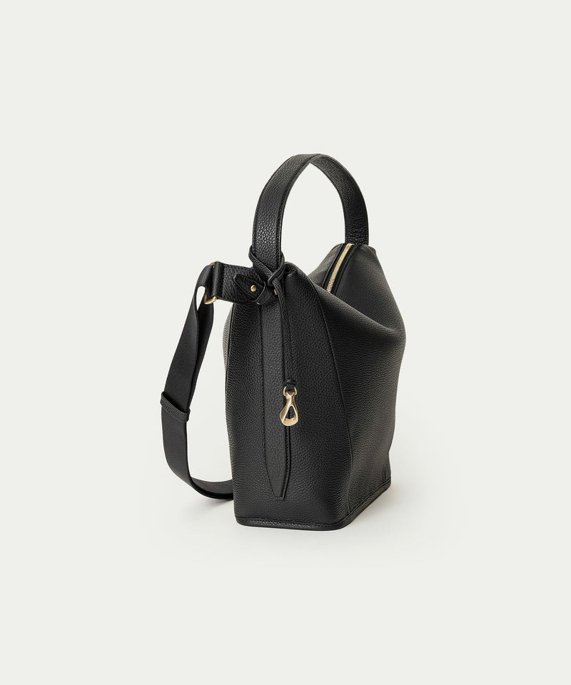 手持ち・肩掛けができる30mm幅のレザーハンドルと、斜め掛けもできる38mm幅のショルダーベルトを融合させた、多様なコーディネートにも合わせやすい2WAYショルダーバッグ。ボディと同じ「シュリンクレザー」による肉厚のハンドルは、手や肩でしっかりと持てる安心感があるとともに、マチ部分に取り付けた付け根を長くすることで、スリムなフォルムながらも置いて自立できる仕様になっています。