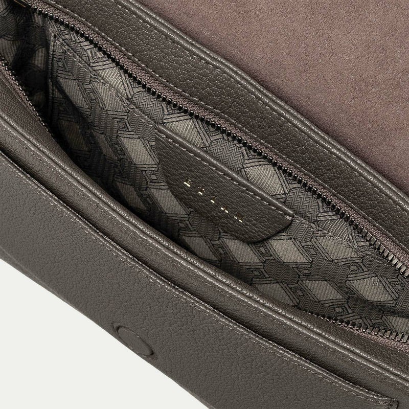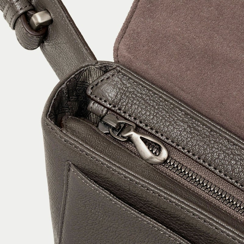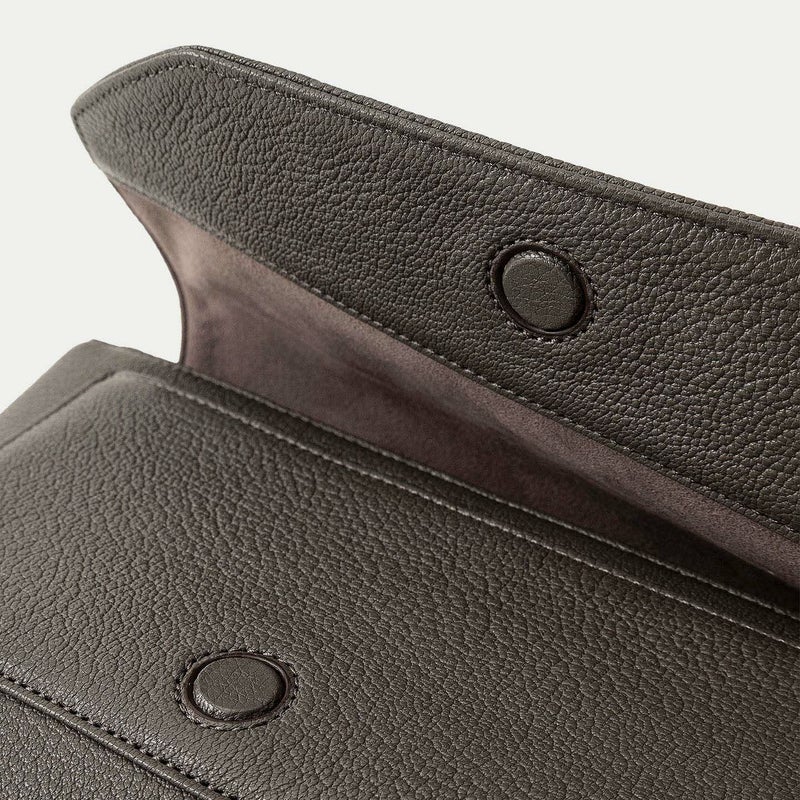 クラシックな印象のフラップは、マグネット式で簡単に開け閉めでき、天ファスナーも設けることで荷物の落下を防止する配慮も。また、装着時の重要なファクターになるショルダーベルトは、シルクのように上品で落ち着いた中空糸ナイロンテープを採用し、軽量な実用性と見た目の美しさにこだわっています。それらのチャームにもなっているYKK最高峰エクセラWファスナーの引き手や、ショルダーベルトの接続部・長さ調整部には、真鍮金具を使用。ブラックニッケルにシルバーヘアラインを施した特別仕様で、スタイリッシュさをさらに高めています。