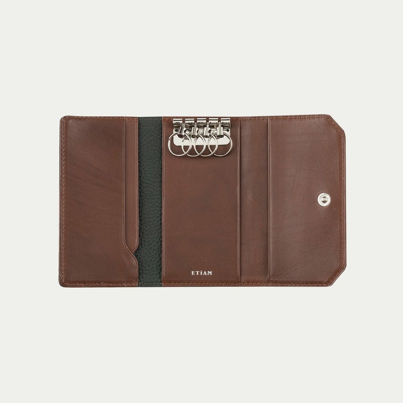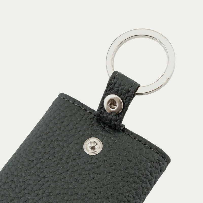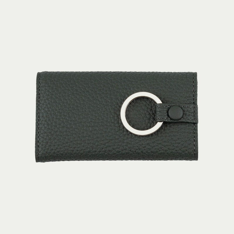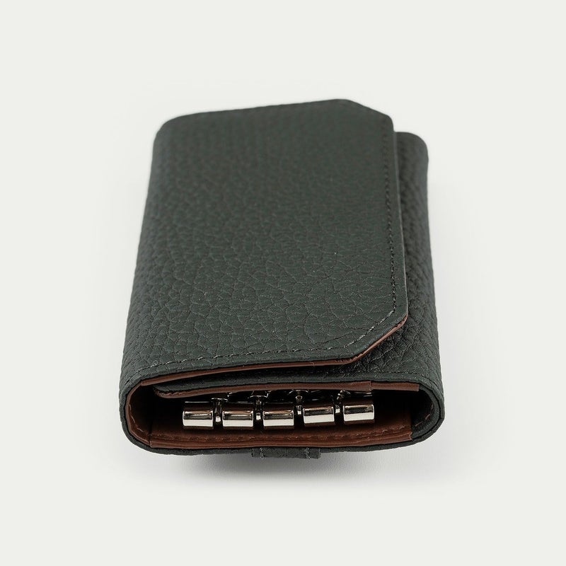 ナチュラルなシボが外装を飾る、ドイツ・ベリンガー社製「シュランケンカーフ」の薄さにもこだわるなど、三つ折りタイプながらスリムなフォルムを追求しているキーケース。薄くしても鞣しが優れているので、もっちりとした柔らかな弾力による触り心地が損なわれないのも魅力です。自動車の車種などにより異なる鍵の大きさに対応するために、メインの二重リングは外装に装備させ、キーリング4つを内装に備えた設計。その内装の素材としても牛革を採用し、上質な贅沢感を演出しています。