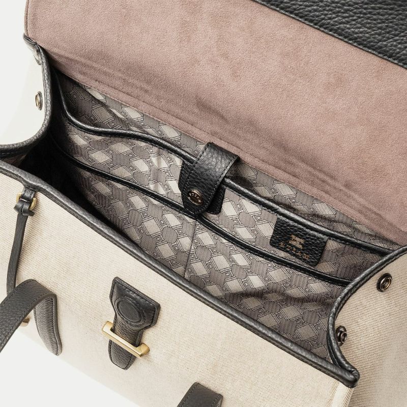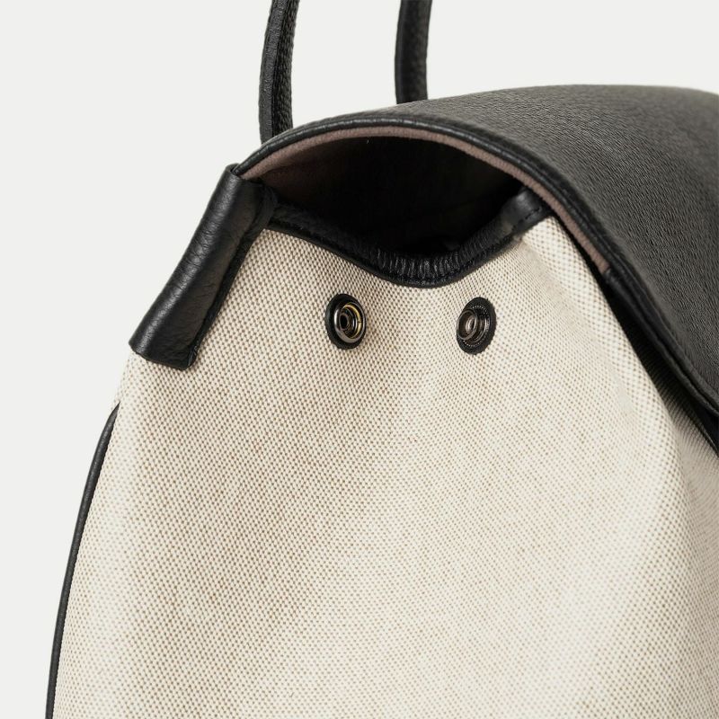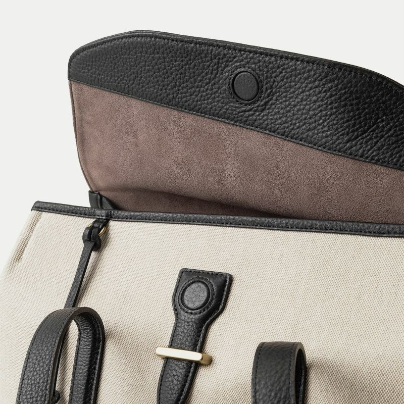 また、フラップ・ハンドル・底・ベルトに採用している「シュリンクレザー」は、「キャンバス生地」との絶妙なバランスでファッション性を高めながら、置いて自立させる際の安定感・バランス感にも貢献。マテリアルの融合だけでなく、クラシックさとモダンさを併せ持つハイブリットな佇まいも魅力になっています。