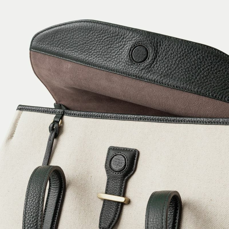 旅行・出張・ゴルフなどで少し荷物が多いときにも、上品にコーディネートして持ち歩ける、13インチのノートPCやA4の書類を収納できて手持ちハンドル仕様のフラップトートバッグ。フロントとマチが一体になった、「キャンバス生地」一枚仕立てにすることで、ふっくらとした美しいシルエットを叶えるとともに、サイドに設けられたスナップボタンでマチ幅を調整できたり、フラップをイミテーションの差し込み金具にしてマグネットで簡単に開け閉めできたりするなど、エレガントなデザイン性とカジュアルな機能性を併せ持っています。