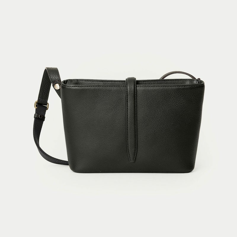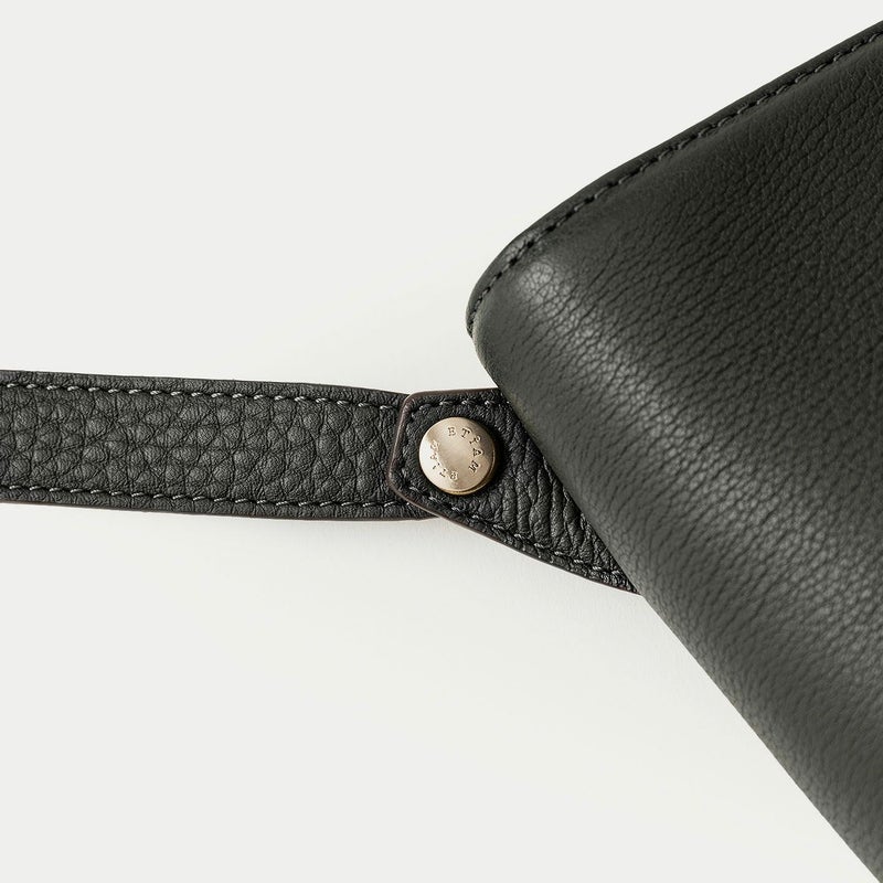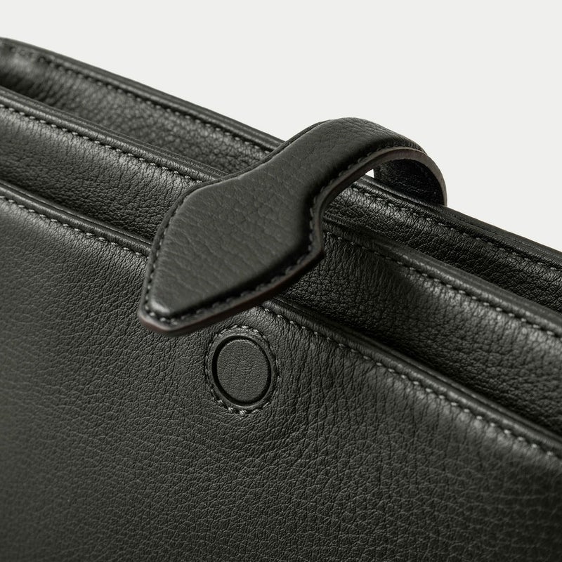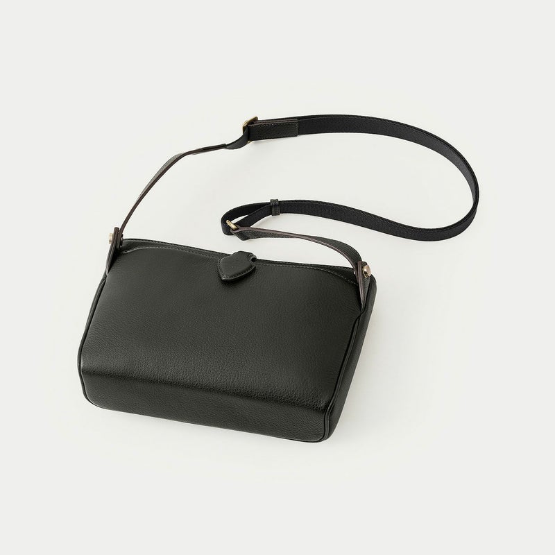 気持ちと姿勢を正してくれるようなイメージを抱く、前面センターにあしらわれた肉厚ベルトと、天ファスナーによる二重の開閉にすることで、大事に収納物を持ち歩ける横型ミニショルダー。安心感を与えながらも、ベルトが背面のマグネット式で留まっており、持ち物の出し入れを素早く行えます。また、同じマグネットで開閉できる背面ポケットも設け、スマートフォンなどの収納に活躍するとともに、背面と底面を一枚仕立て構造にすることで、ハギがなく体あたりも快適な柔らかさを実現。ファスナーの両端は、型紙の形状を半円にして隙間を抑えていて、貴重品なども安心して収納しておけます。