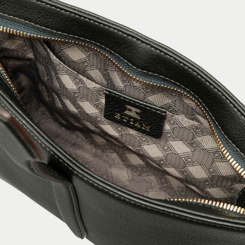 さらに、「シュリンクレザー」のボディは、長財布を入れられる横幅のサイズ感と、内装にフリーポケットも備えた程よいマチ幅により、体に寄り添うような掛け心地も追求。そのボディとカフスボタンを思わせるオリジナル「真鍮金具」で接続する、細めの幅で繊細な印象のショルダーベルトは、長さ調節の範囲も大きめに設計しているので、アウターの外側からでもアウターの内側や着ていない場合でも、上品なコーディネートへと導きます。