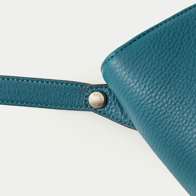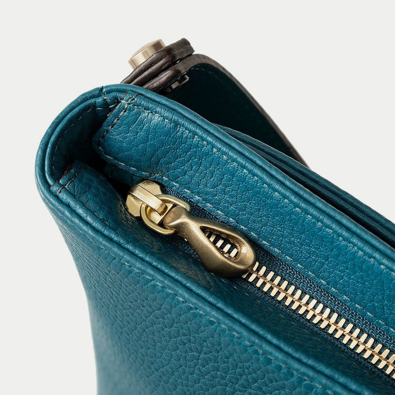 気持ちと姿勢を正してくれるようなイメージを抱く、前面センターにあしらわれた肉厚ベルトと、天ファスナーによる二重の開閉にすることで、大事に収納物を持ち歩ける横型ミニショルダー。安心感を与えながらも、ベルトが背面のマグネット式で留まっており、持ち物の出し入れを素早く行えます。また、同じマグネットで開閉できる背面ポケットも設け、スマートフォンなどの収納に活躍するとともに、背面と底面を一枚仕立て構造にすることで、ハギがなく体あたりも快適な柔らかさを実現。ファスナーの両端は、型紙の形状を半円にして隙間を抑えていて、貴重品なども安心して収納しておけます。