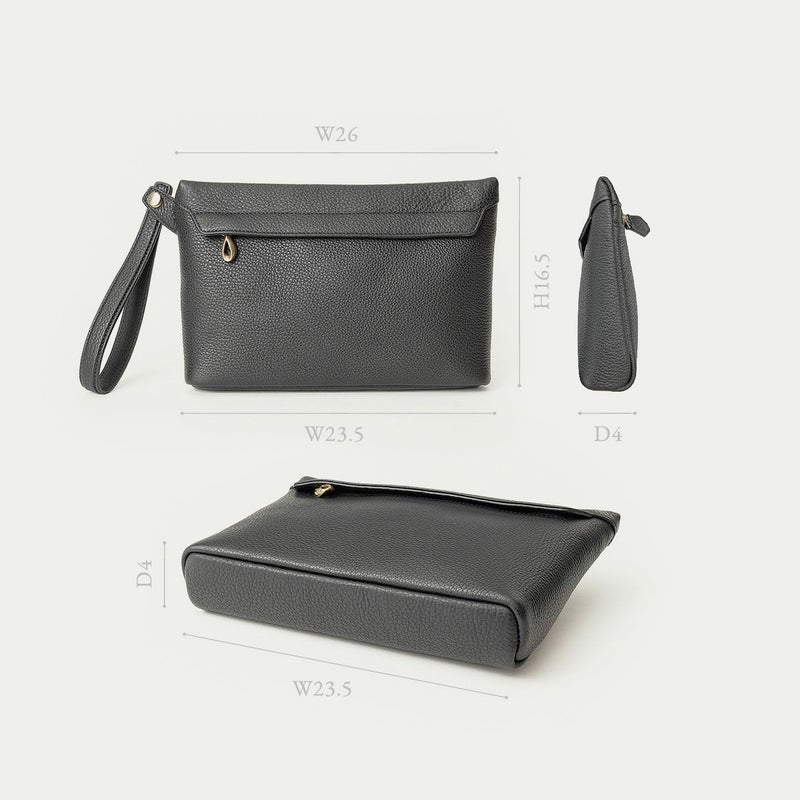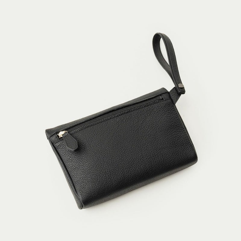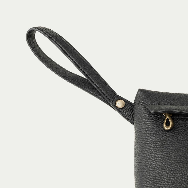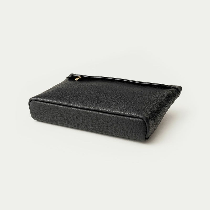 コンパクトながらも長財布を収納できるサイズ感で、ストラップを手首に引っ掛けたり手持ちしたりしながら、軽やかに素早く持ち歩いて行けるポーチ。スポンジ状の芯材を使用することで、外装の「シュリンクレザー」にも程よい弾力を与えて、美しいシルエットを保ちつつ上品なコーディネートができるとともに、収納している貴重品を守る緩衝材の役割も担っています。また、メインポケットの開口を背面にした内縫いの構造にすることで、ふっくらと丸みを帯びたボディを印象的に。背面のファスナーも金属ではなくコイルファスナーにして、「シュリンクレザー」を覆わせているので、カジュアル過ぎない見た目ととともに、手で抱えたときに摩擦で洋服を痛めない配慮も叶えています。