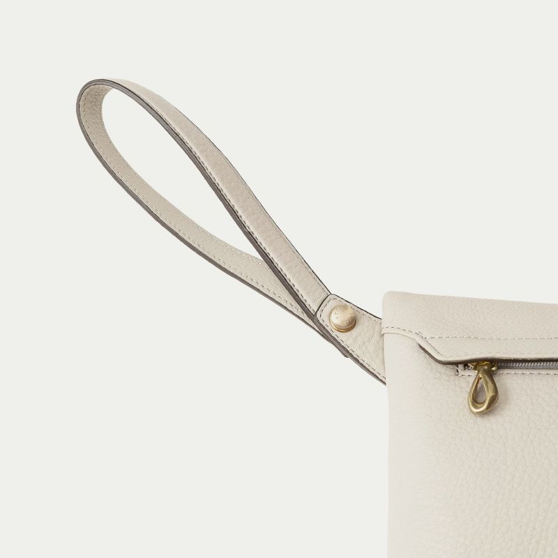 コンパクトながらも長財布を収納できるサイズ感で、ストラップを手首に引っ掛けたり手持ちしたりしながら、軽やかに素早く持ち歩いて行けるポーチ。スポンジ状の芯材を使用することで、外装の「シュリンクレザー」にも程よい弾力を与えて、美しいシルエットを保ちつつ上品なコーディネートができるとともに、収納している貴重品を守る緩衝材の役割も担っています。また、メインポケットの開口を背面にした内縫いの構造にすることで、ふっくらと丸みを帯びたボディを印象的に。背面のファスナーも金属ではなくコイルファスナーにして、「シュリンクレザー」を覆わせているので、カジュアル過ぎない見た目ととともに、手で抱えたときに摩擦で洋服を痛めない配慮も叶えています。
