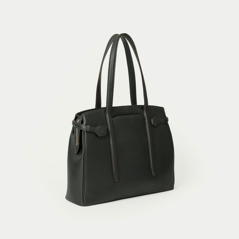 13インチのノートPCを入れられる余裕のあるサイズ感で、電車の座席・車の助手席・肩掛け時などでもかさばらない、気分的にも余裕が持てるサイドベルトトート。縦型シルエットを意識した佇まいと、前面とマチをシームレスで繋ぐことで描かれる柔らかなカーブが、ソフトな印象でリラックス感のある美しいシルエットへと導いています。