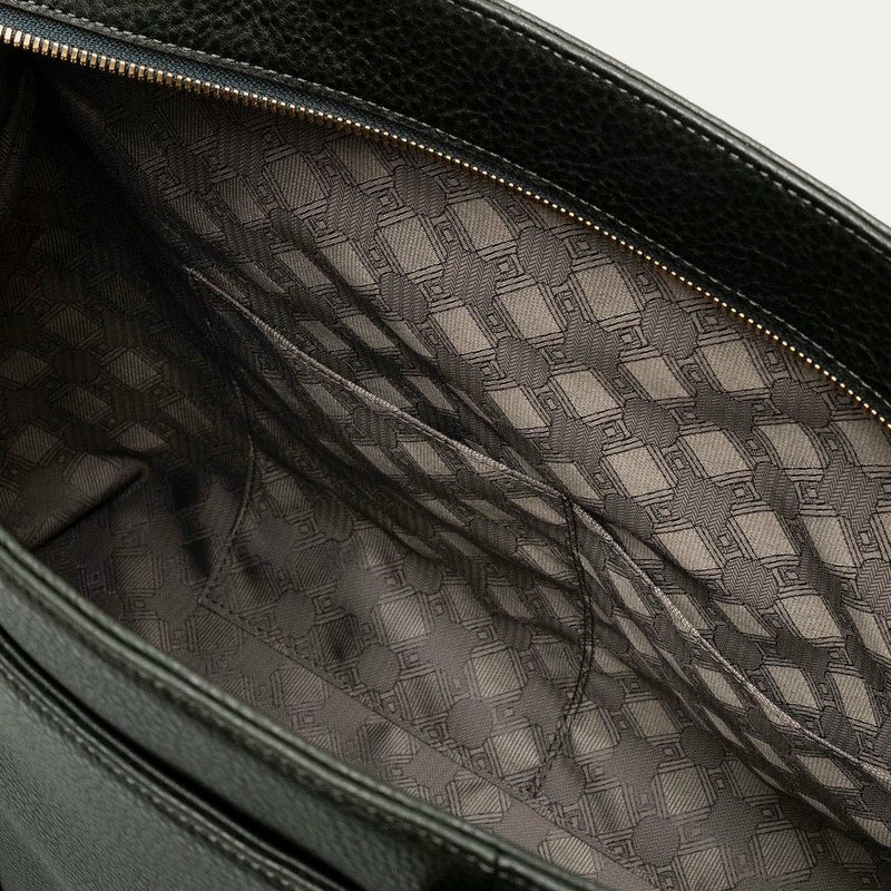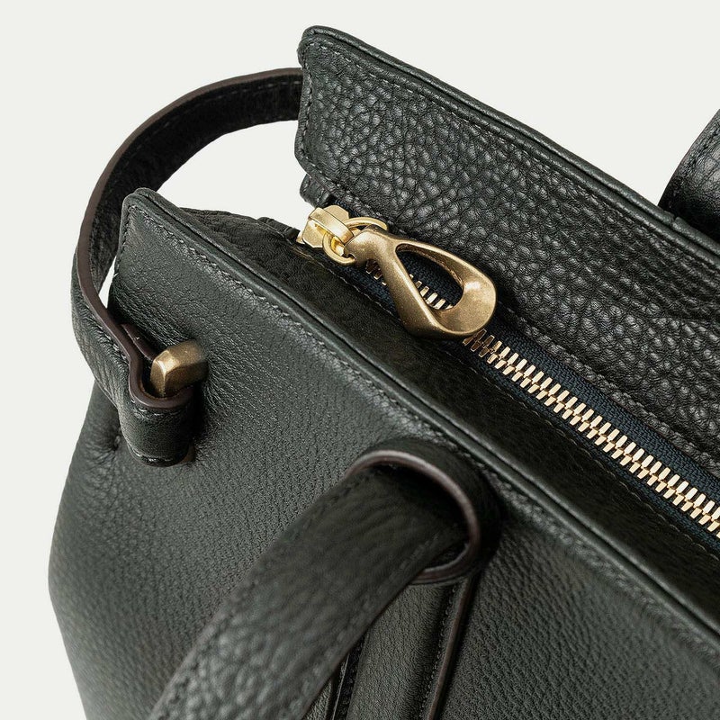 デザインを象徴している肉厚のサイドベルトは、フロント両サイドの真鍮金具を起点に、背面の両サイドのマグネット留めへと、マチの上部をすぼめるシャープな横ラインが魅力的。また、YKK最高品質のエクセラWによる上品な光沢のファスナーを開けてマチを開くと、マグネットが自然に外れて出し入れしやすい構造になり、レザーループでサイドベルトが垂れ下がらない設計も施されています。 緩やかなカーブのボディ上面が、ゆとりのあるイメージを演出するとともに、ハンドルを肩に掛けて持ち歩くときも両端が気にならずに快適。さらに、上面を下向きにてファスナーを一段下げることで、ファスナーを開けたままでも裏地が見えなかったり、金属を見えづらくして上品さを保ったりするとともに、背面ポケットのカットラインを曲線にするなど、細やかな見え方にもこだわっています。