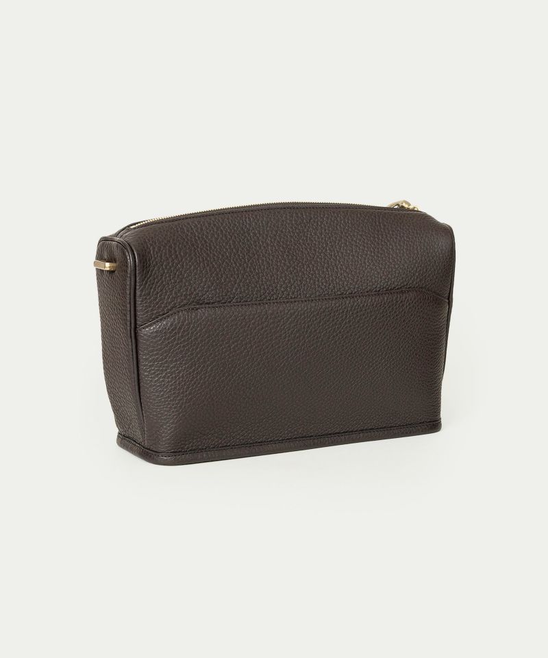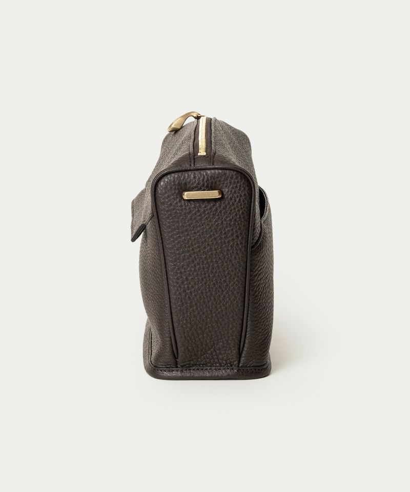 シボ感が美しい「シュリンクレザー」のボディは、ハリと弾力がありながら、柔らかさも兼ね備えさせた芯材使いで、型崩れしにくい特長も。前面のファスナーポケットは、ファスナーを覆う上品な比翼仕立てで、スマートフォンや小物などをしっかりと収納可能。さりげなく覗くオリジナル真鍮金具が、控えめなアクセントとして上質感を演出します。背面のフリーポケットは、あえて開閉具を設けずに、パスケースやスマホなどを素早く出し入れできる快適さを実現。ポケット開口部の両端を縫い留めることで、開き過ぎずに美しいシルエットを維持させています。