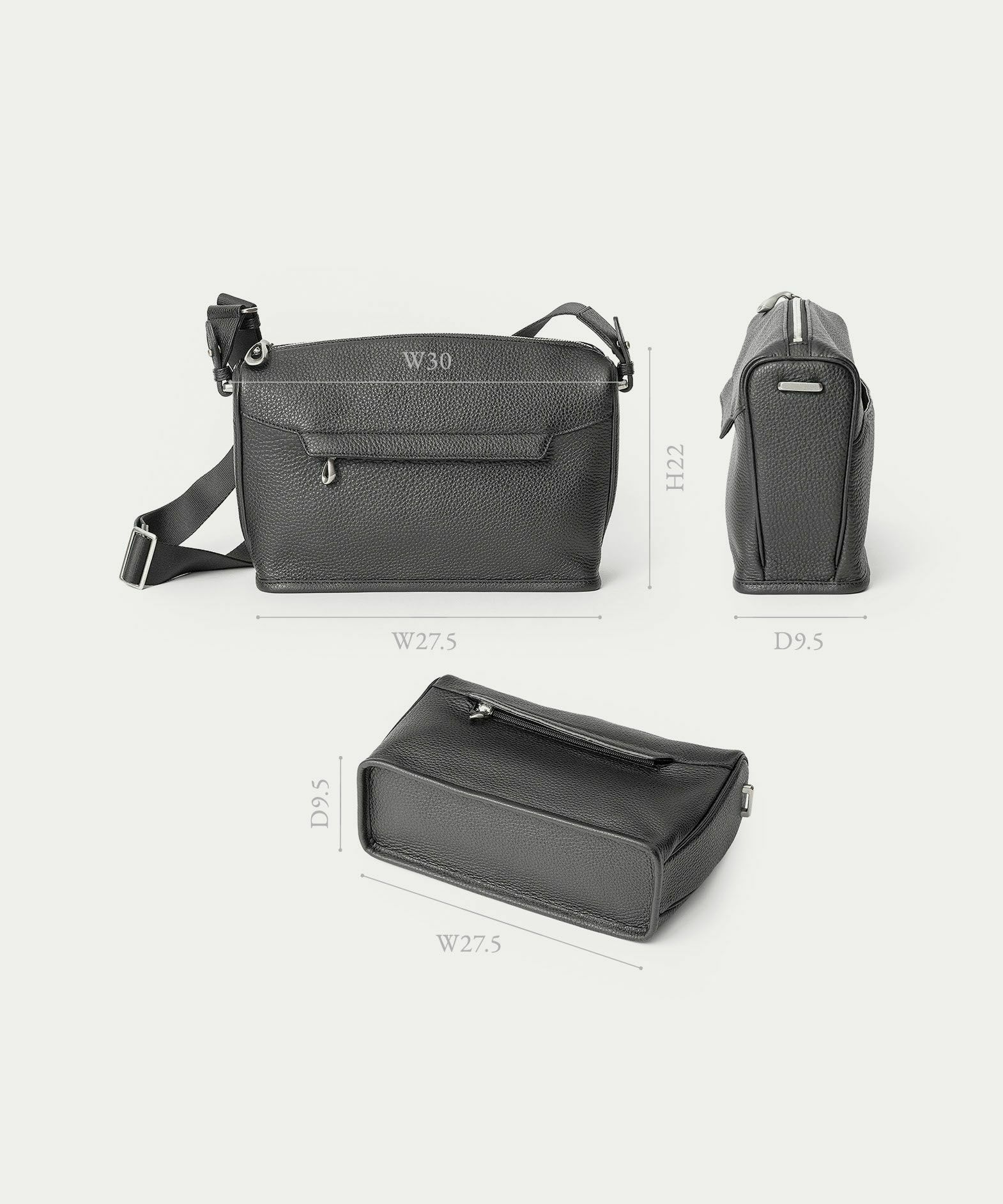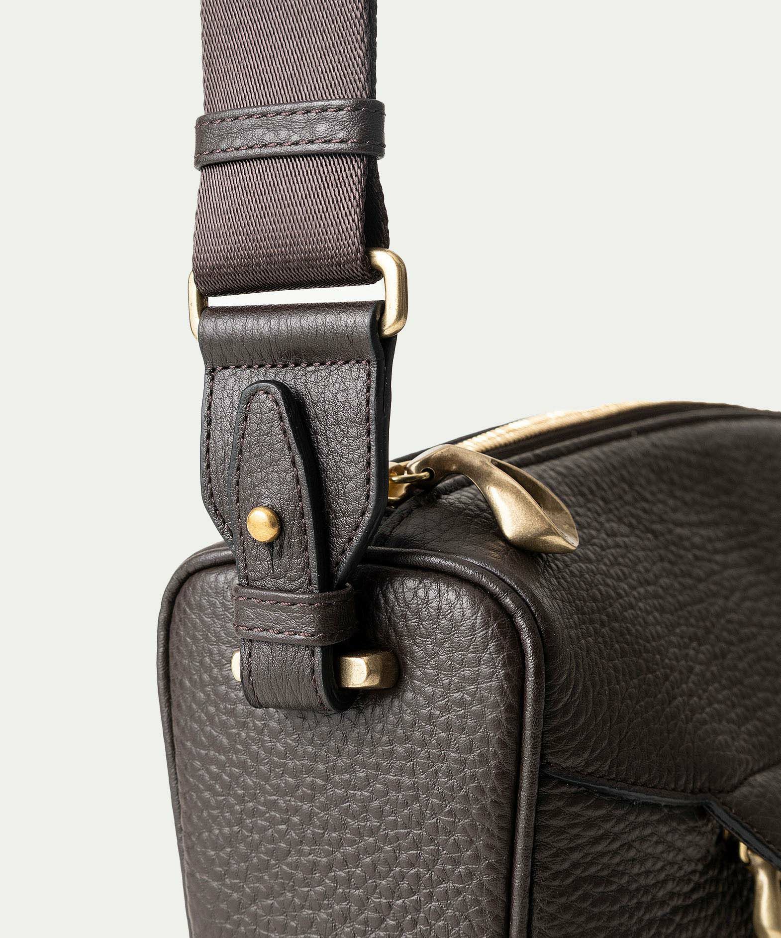 アーチ状の天面とともに名称の由来でもある、ループ状のパイピングが印象的なマチには、真鍮金具がショルダーベルトとの接続部としてあしらわれ、縫製ではなく金具留めを採用。ベルトを外してクラッチバッグのように手持ちする際にも、スマートな印象で持ち歩けます。さらに、柔らかなボディに対して、マチとともに硬めに仕上げている底面は、レザーのフレーム構造にすることで、フォルムの美しさとともに自立性も兼ね備えさせています。ショルダーのナイロンテープには、高密度に織った中空糸を用い、軽量ながらもヘタらない厚みを確保。シルクのような光沢もあり、カジュアルになりがちな斜め掛けでもスタイリッシュに引き立てます。