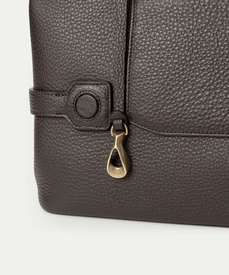 背面のフリーポケットは、あえて開閉具を設けない大きめの設計なので、頻繁に出し入れする収納に便利。また、背面の両サイドに、マチのベルトのホックも備えており、荷物が少ないときなどにはホックの位置を変えることで、マチの幅を狭めることもできます。マチの上部に取り付けているショルダーベルトの接続金具には、ブラックニッケルメッキを施したオリジナル真鍮金具を採用。ショルダーベルトを外しているときでも目立つことなく、洗練された雰囲気を醸し出します。