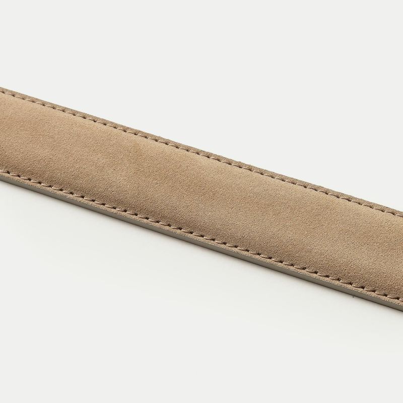 ファンダメンタルな普遍性と、ファッショナブルな独創性を併せ持つバッグブランドが、時代や流行さえも超えていく、新たな魅力のアイテムとして生み出したスエード ベルト。定番のV字をベースにしたモダンなデザインの剣先を通す、真鍮製のバックルにゴールドメッキを施すとともに、鉄製のサイドフリー金具もバックルのゴールドに近づけることで、エレガントな高級感を演出しています。