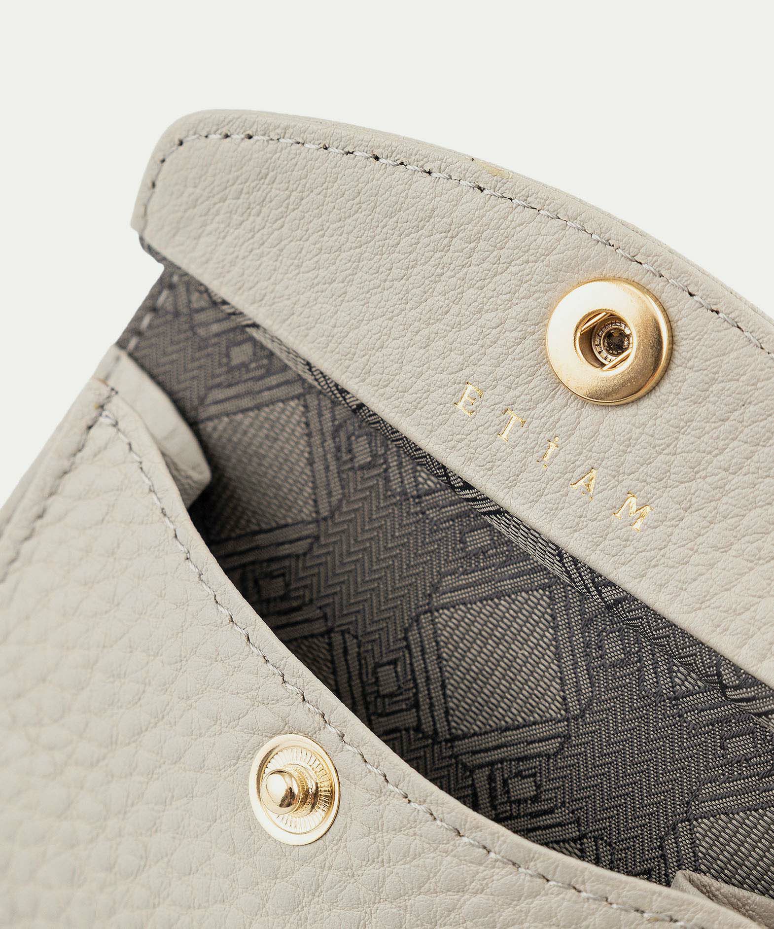 前面に設けているスナップボタン開閉式のマチ付きフリーポケットは、マチも開口部も広めに設計しているので、カード・名刺だけでなく小銭・三つ折り紙幣などをマルチに収納できるとともに、しっかり目視しながら出し入れしやすいのも特長。また、高級感あふれる真鍮製のオリジナルホックや、マチの付け根の流線形の美しさなど、洗練されたデザイン性も楽しめます。背面には、透明フィルム付きのカードケースを装備。オフィスのカードキーを入れたり、名刺を収納したり、ビジネスシーンでも洒落感を携えて使いこなせます。