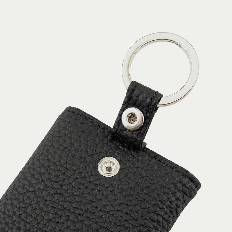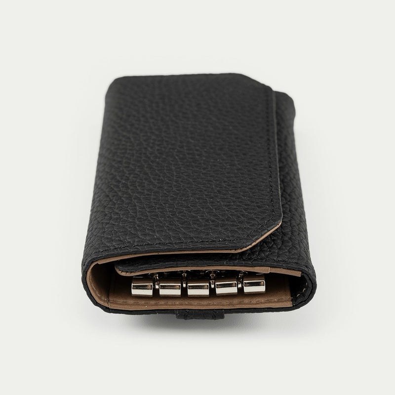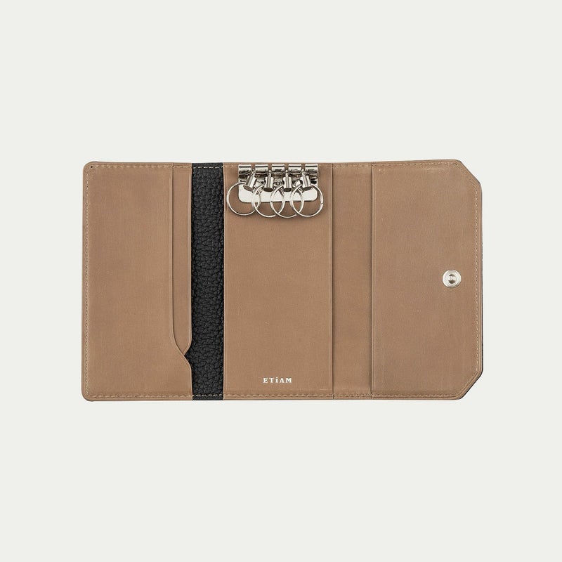 ナチュラルなシボが外装を飾る、ドイツ・ベリンガー社製「シュランケンカーフ」の薄さにもこだわるなど、三つ折りタイプながらスリムなフォルムを追求しているキーケース。薄くしても鞣しが優れているので、もっちりとした柔らかな弾力による触り心地が損なわれないのも魅力です。自動車の車種などにより異なる鍵の大きさに対応するために、メインの二重リングは外装に装備させ、キーリング4つを内装に備えた設計。その内装の素材としても牛革を採用し、上質な贅沢感を演出しています。