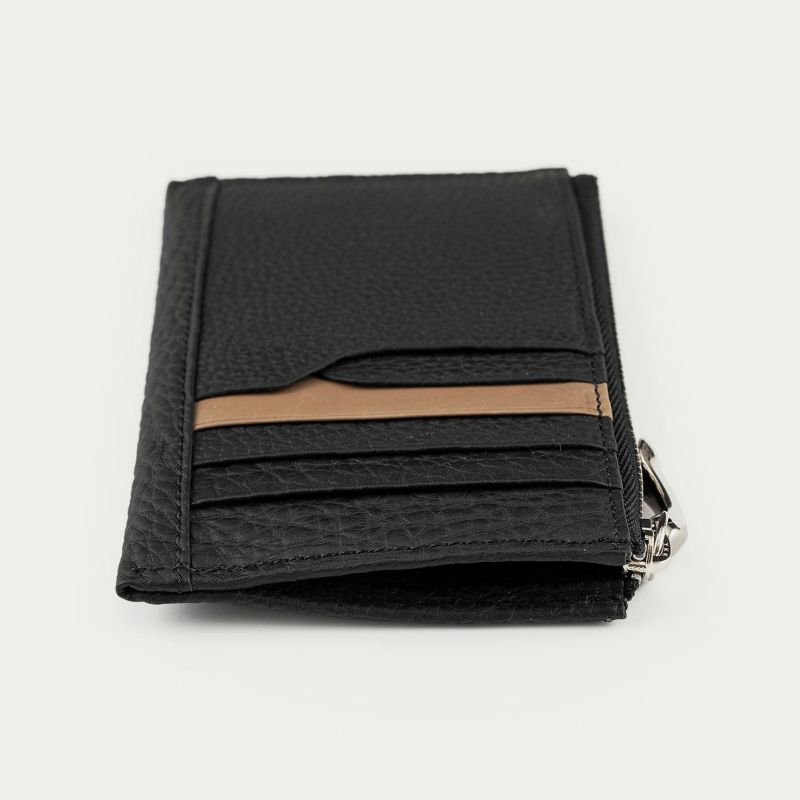 また、ナチュラルなシボが魅力的なドイツ・ベリンガー社製「シュランケンカーフ」をメインにした外装には、異なる素材・カラーの牛革をワンポイントのアクセントとして配したカードポケット5つを備え、オールインワンとして使いこなせるのも魅力。さらに、その差し色を引き立てるカッティングラインにはカーブを施しているので、ひとつ上の洒落感を醸し出してくれます。