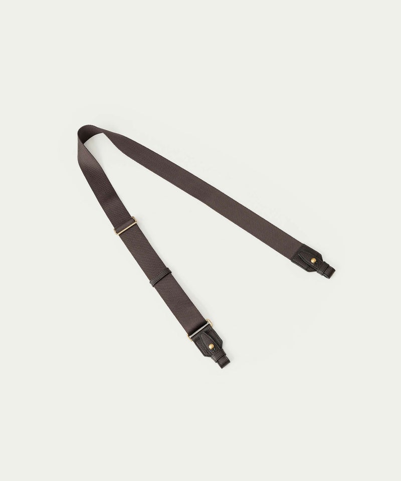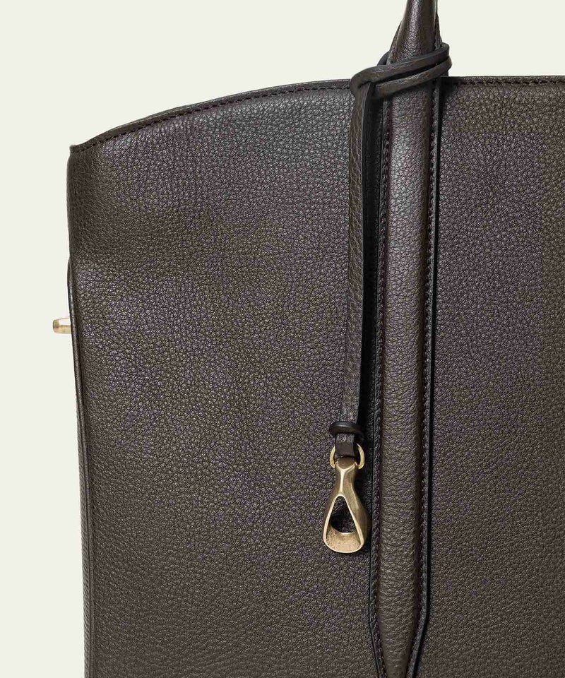 さらに、ハンドルとハンドルの間を狭くして緊張感を持たせながら、中央のグリップ部分は二つ折りにすることで持ちやすく、握るだけでなく手首にも掛けやすいように長さも微調整。10cmのマチでスリムながらも、底面から迫り上がった船底構造で自立でき、マチ上部の真鍮金具に付属のショルダーベルトを装着すれば、肩掛けのハンズフリーでも持ち歩けます。