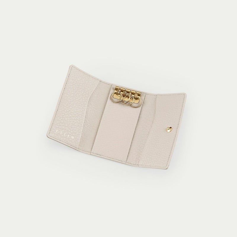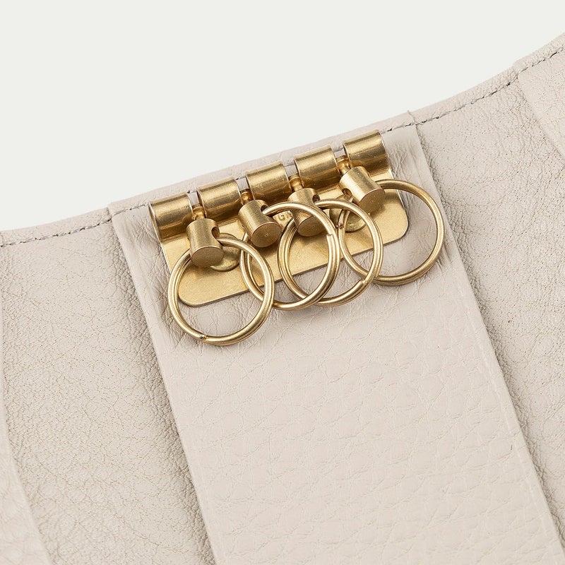 手のひらに収まるコンパクトなサイズ感で、スマート&軽快な普段使いができる、三つ折りタイプのキーケース。4連のキーリングは、二重リング式を採用しているので、大切な鍵を落とすことなく安心して持ち歩けます。そのキーリングの背面に設けたスリーブには、カードを収納することも可能。また、三つ折りの両サイドそれぞれに備えた、フリーポケット2つのカッティングラインを、左右シンメトリーにした美しいカーブを描かせているのも魅力的で、四つ折りに畳んだ紙幣も入れておけます。