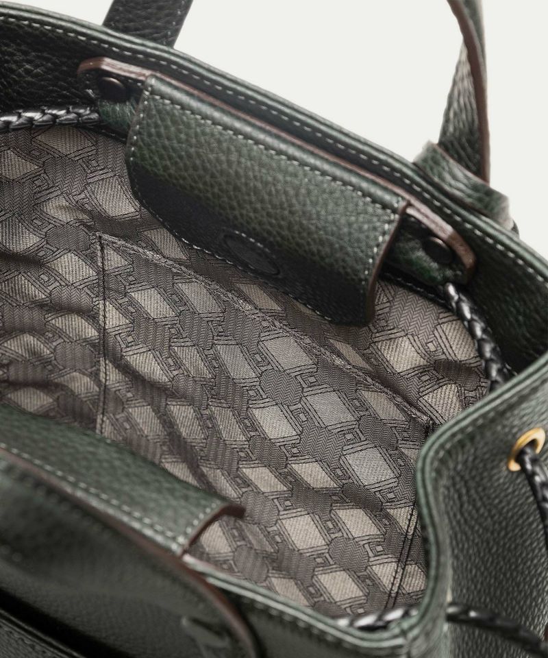 巾着型のドローストリング仕様で、紐の動きが美しく絞られたマチに遊び心を添えながら、前面・背面は内装に通すことで、洗練されたスタイリュシュな佇まいへ。レザーを編み込んだような上質なポリエステル製で、強度にも優れており、先端のレザー部にショルダーベルトを接続できる設計になっています。しなやかで柔軟な接続部が、軽やかでアクティブな雰囲気を演出。シルクのような光沢感が美しいナイロンテープは、カジュアルになりがちな斜め掛けも上品に引き立ててくれます。