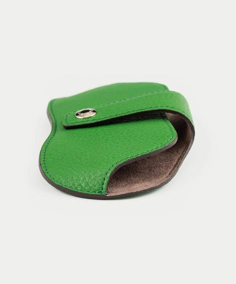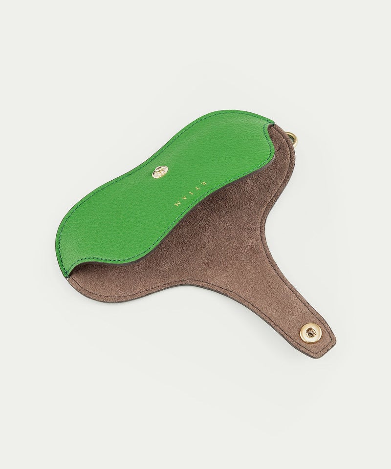 収納して持ち運ぶのではなく、必要なときに必要なものを組み合わせる感覚で、気軽に付け替えて携えられる、『Combi』シリーズのアイウェアケース。前面は、流線形で立体的なパターンにすることで、厚みのあるサングラスも収納でき、背面からベルト先端までのキレイな一枚仕立てや、高級感あふれる真鍮製のオリジナルホックをあしらっているのも個性的です。外装には、シボ感が魅力的な「シュリンクレザー」、内装・ベルト内側には、柔らかい起毛素材でレンズ・テンプルにキズをつけにくい「ポリエステルスエード生地」を採用し、外装と内装の間には、程よく柔らかい芯材を使用して、包み込むようにアイウェアを保護。紫外線対策や視力補正などで必要なサングラスやメガネを、やさしく美しく収納できるアイテムへと昇華させています。