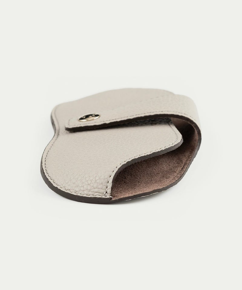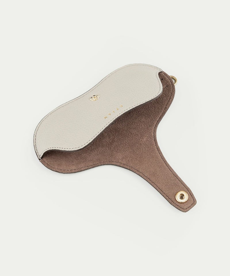 収納して持ち運ぶのではなく、必要なときに必要なものを組み合わせる感覚で、気軽に付け替えて携えられる、『Combi』シリーズのアイウェアケース。前面は、流線形で立体的なパターンにすることで、厚みのあるサングラスも収納でき、背面からベルト先端までのキレイな一枚仕立てや、高級感あふれる真鍮製のオリジナルホックをあしらっているのも個性的です。外装には、シボ感が魅力的な「シュリンクレザー」、内装・ベルト内側には、柔らかい起毛素材でレンズ・テンプルにキズをつけにくい「ポリエステルスエード生地」を採用し、外装と内装の間には、程よく柔らかい芯材を使用して、包み込むようにアイウェアを保護。紫外線対策や視力補正などで必要なサングラスやメガネを、やさしく美しく収納できるアイテムへと昇華させています。