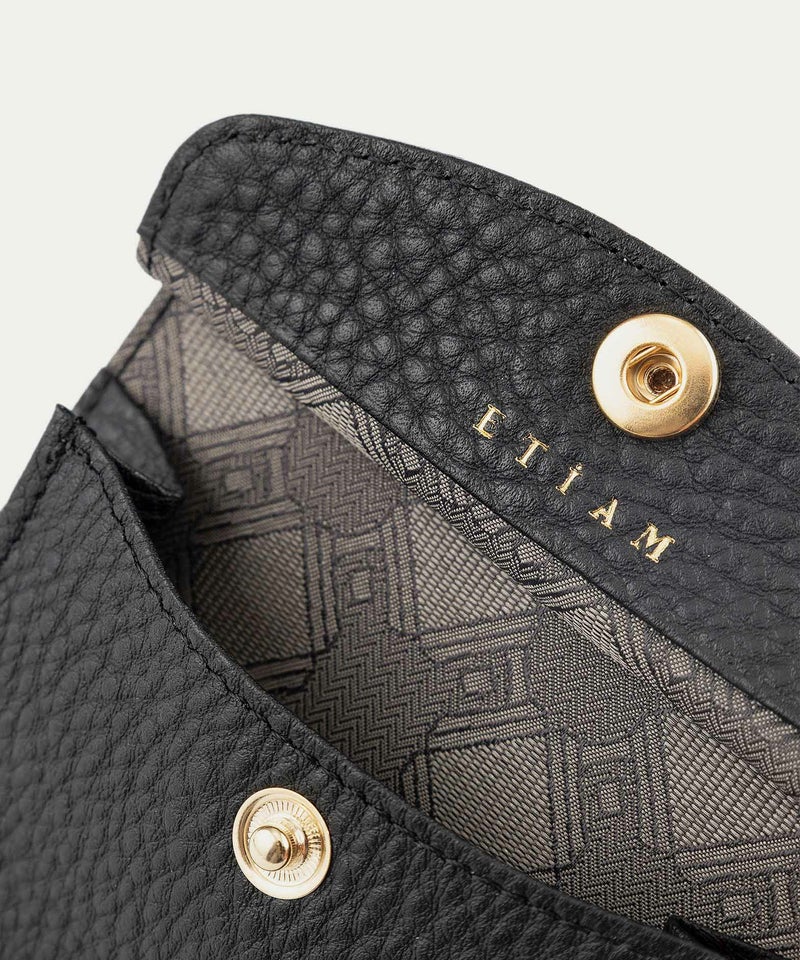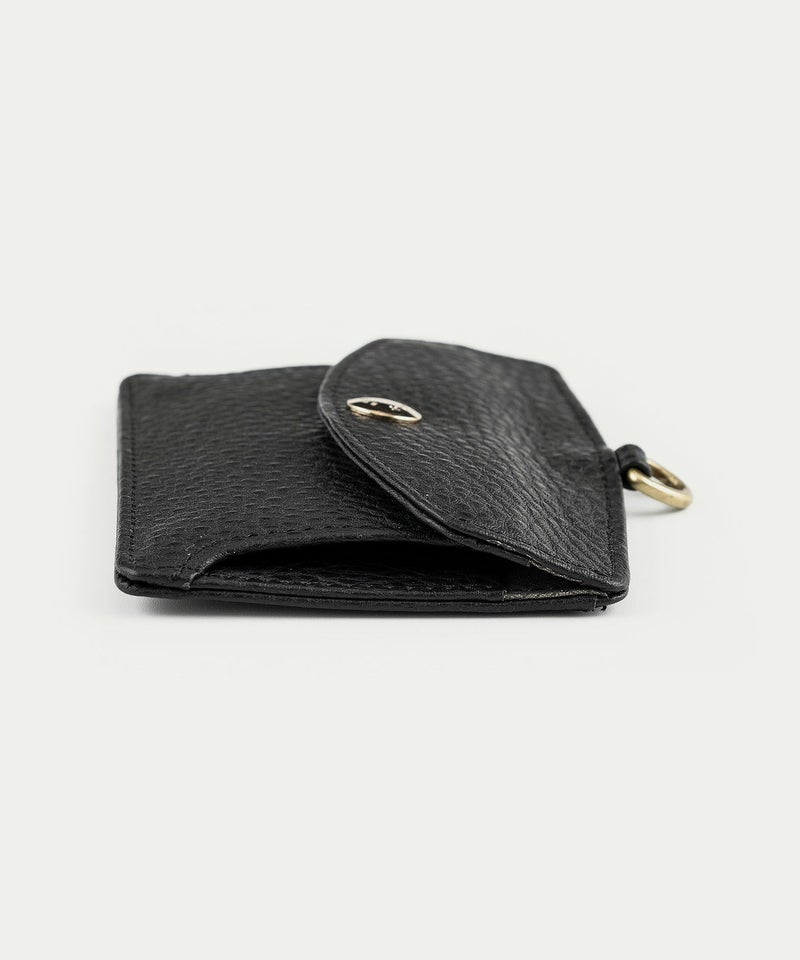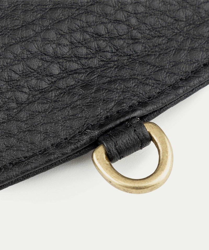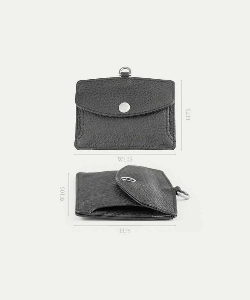 前面に設けているスナップボタン開閉式のマチ付きフリーポケットは、マチも開口部も広めに設計しているので、カード・名刺だけでなく小銭・三つ折り紙幣などをマルチに収納できるとともに、しっかり目視しながら出し入れしやすいのも特長。また、高級感あふれる真鍮製のオリジナルホックや、マチの付け根の流線形の美しさなど、洗練されたデザイン性も楽しめます。背面には、透明フィルム付きのカードケースを装備。オフィスのカードキーを入れたり、名刺を収納したり、ビジネスシーンでも洒落感を携えて使いこなせます。